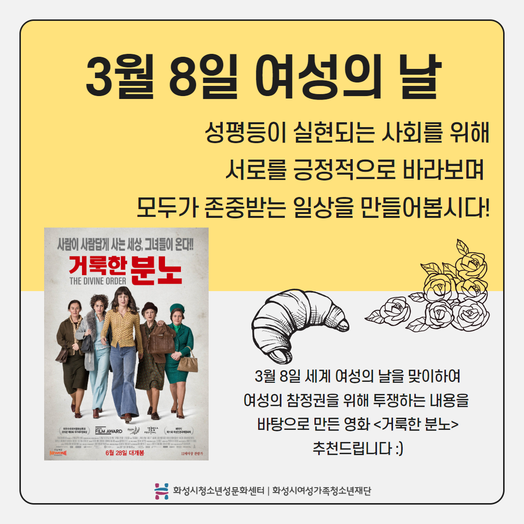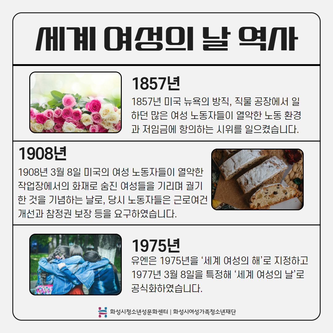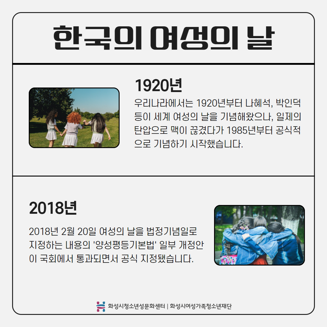 안녕하세요 화성시청소년성문화센터입니다. 3월 8일 세계 여성의 날에 대하여 알아보는 캠페인을 준비해보았습니다. 편견과 차별없는 세상 그리고 다름을 존중하고 공평하며 포용적인 세상을 위하여 우리 모두가 존중받는 일상을 만들어봅시다! 감사합니다.
