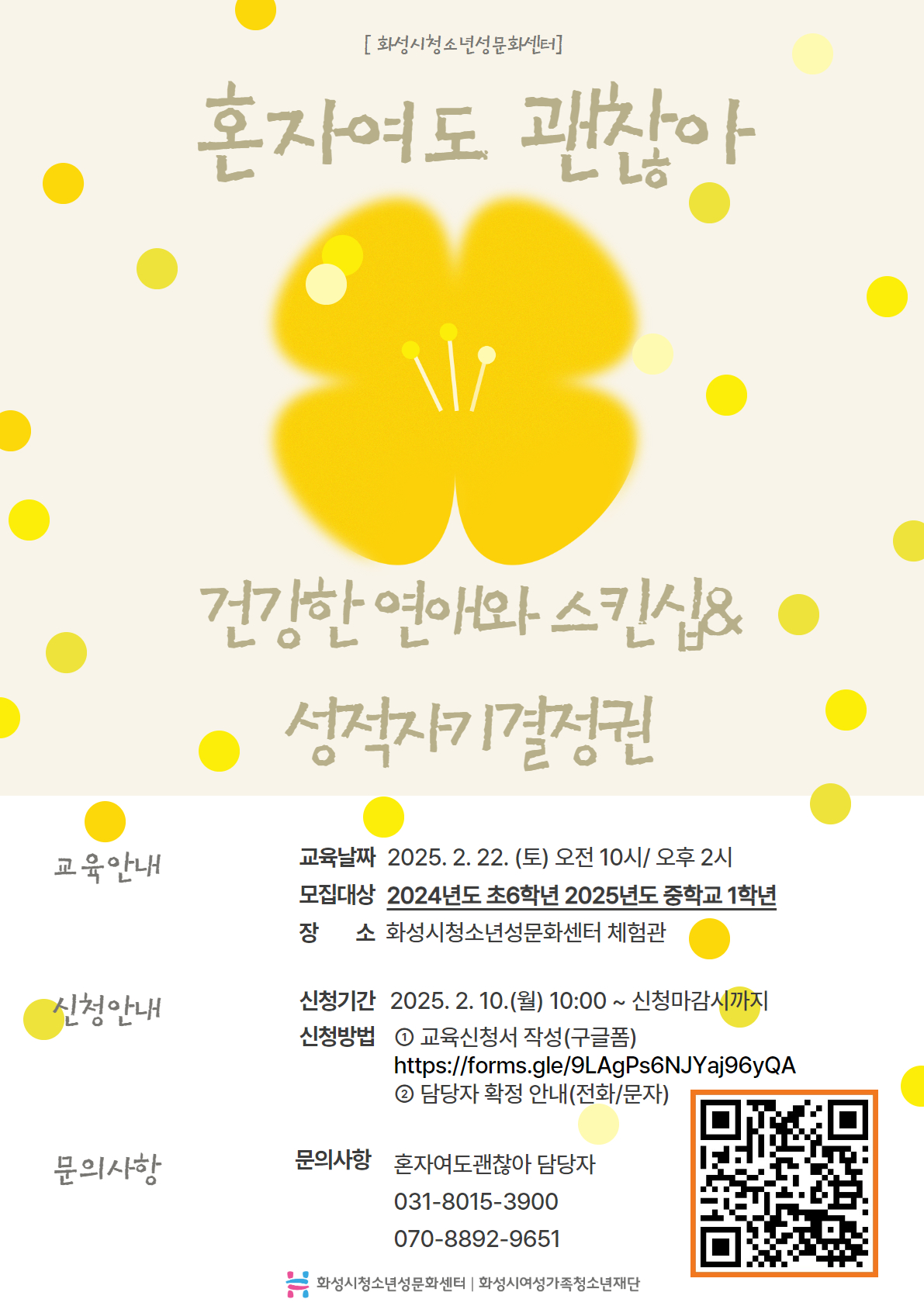 | 제목 | [화성시청소년성문화센터] 2025년 2월 혼자여도괜찮아 신청안내 | ||