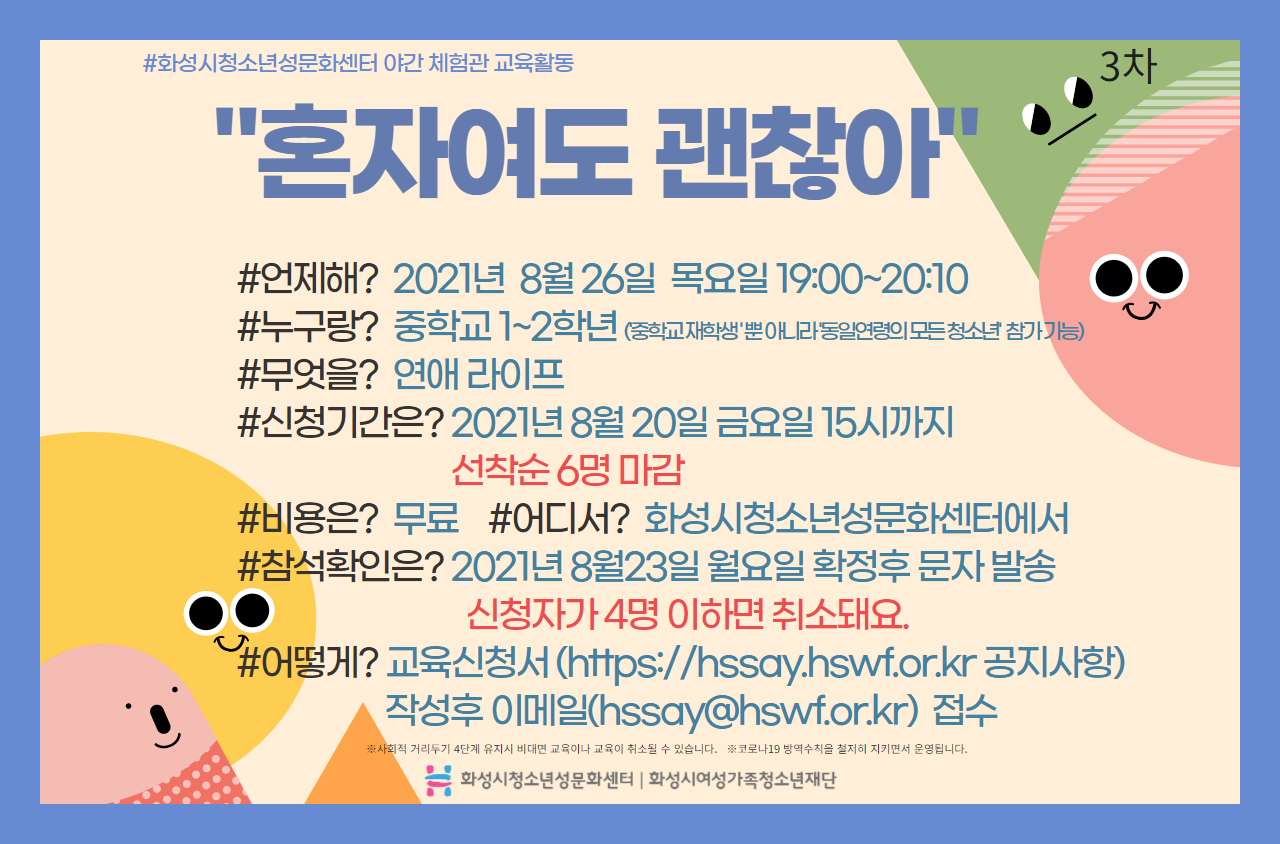 | 제목 | [화성시청소년성문화센터] 2021년 8월 26일 "혼자여도 괜찮아" 참가자 모집 | ||