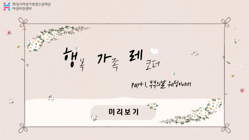 행복한 가족의 모습을 기록하는 ★ 행 (복 ) 가 (족) 레 (코더) ★ , 2022년의 행가레의 첫 프로그램의 주제는 부부였는데요! 가족의 시작점인 " 부부 "와 둘이 하나가 된다는 의미의 부부의날(5월 21일)의 " 숫자 21 "을 합쳐 기획된 행(복) 가(족) 레(코더) part1. 부부의날 웨딩이야기! 2022년 4월부터 7월까지 진했했던 행가레의 촬영현장영상을 공개합니다. 사연을 통해 모집된 화성시 관내 부부 21쌍의 행복하고 웃음이 가득했던 촬영 현장 모습을 담았습니다. 행가레 영상을 보시는 모든 분들에게 이 행복함이 전해질 수 있길 바라봅니다. 화성시여성비전센터 가족사업팀은 " 가족 모두가 행복한 화성 "이라는 슬로건 아래 화성시 내의 행복한 가족문화 확산과 조성을 위해 노력하고 있습니다. 앞으로도 (재)화성시여성가족청소년재단 여성비전센터의 프로그램에 많은 관심 부탁드려요 :)