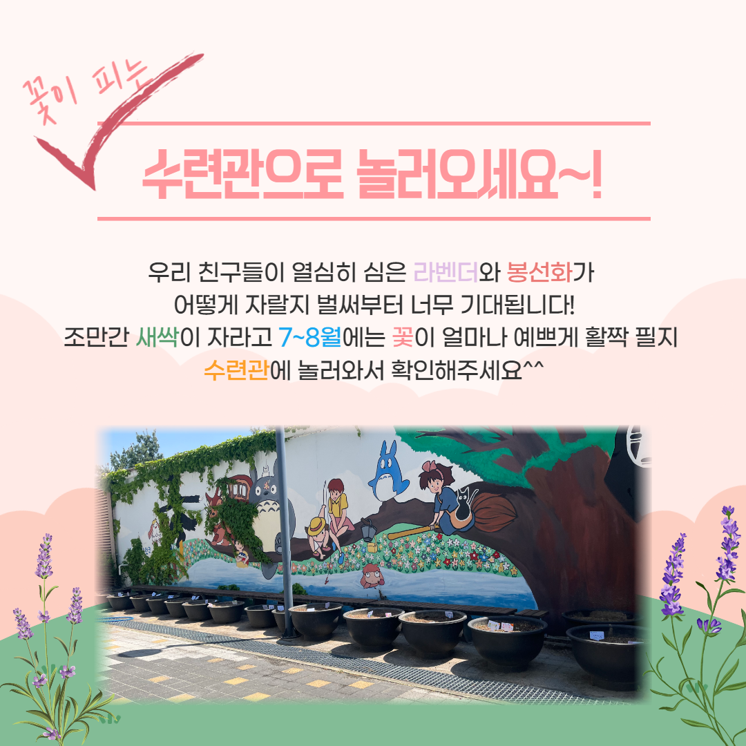 이번 4월 솜공방 프로그램으로 화단을 가꾸고 꽃씨를 심고 다육이 화분을 만드는 활동을 진행하였습니다. 수련관 화단에 우리 친구들이 직접 심은 꽃씨가 여름에 얼마나 활짝 필지 벌써 기대가 됩니다. 꽃이 어떻게 잘 자라는지 지켜보러 수련관에 놀러오세요~!!