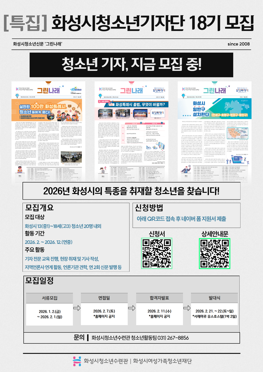 ※ 2026년 화성시청소년기자단 18기 모집 안내 화성시청소년수련관에서는 청소년이 직접 취재하고 기사로 세상을 기록하는 2026년 화성시청소년기자단 18기를 모집합니다. 청소년기자단은 기자 전문 교육부터 현장 취재, 언론기관 견학, 지역신문사 연계 활동까지 경험하며 화성시청소년신문 「그린나래」를 직접 제작·발행하는 활동입니다. 관심 있는 청소년들의 많은 참여를 바랍니다. ○ 모집 개요 모집 대상: 화성시 13세(중1) ~ 18세(고3) 청소년 모집 인원: 20명 내외 활동 기간: 2026년 2월 ~ 12월(연중 활동)