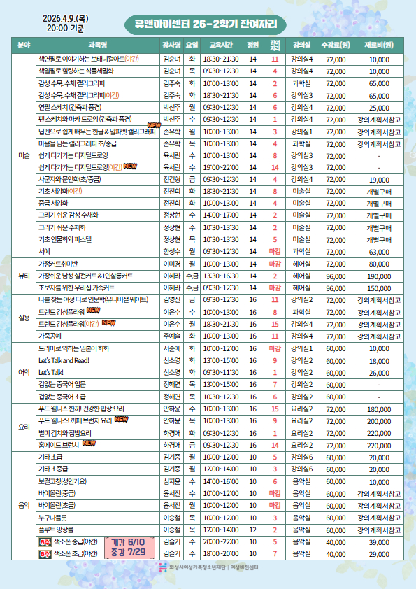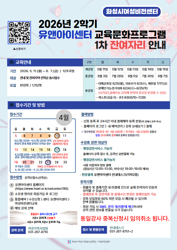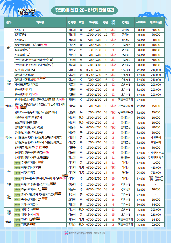 | 제목 | [화성시여성비전센터]2026년 2학기 유앤아이센터{병점} 교육 프로그램 1차 잔여자리 공지(2026. 4. 9. 20:00시 기준) | ||