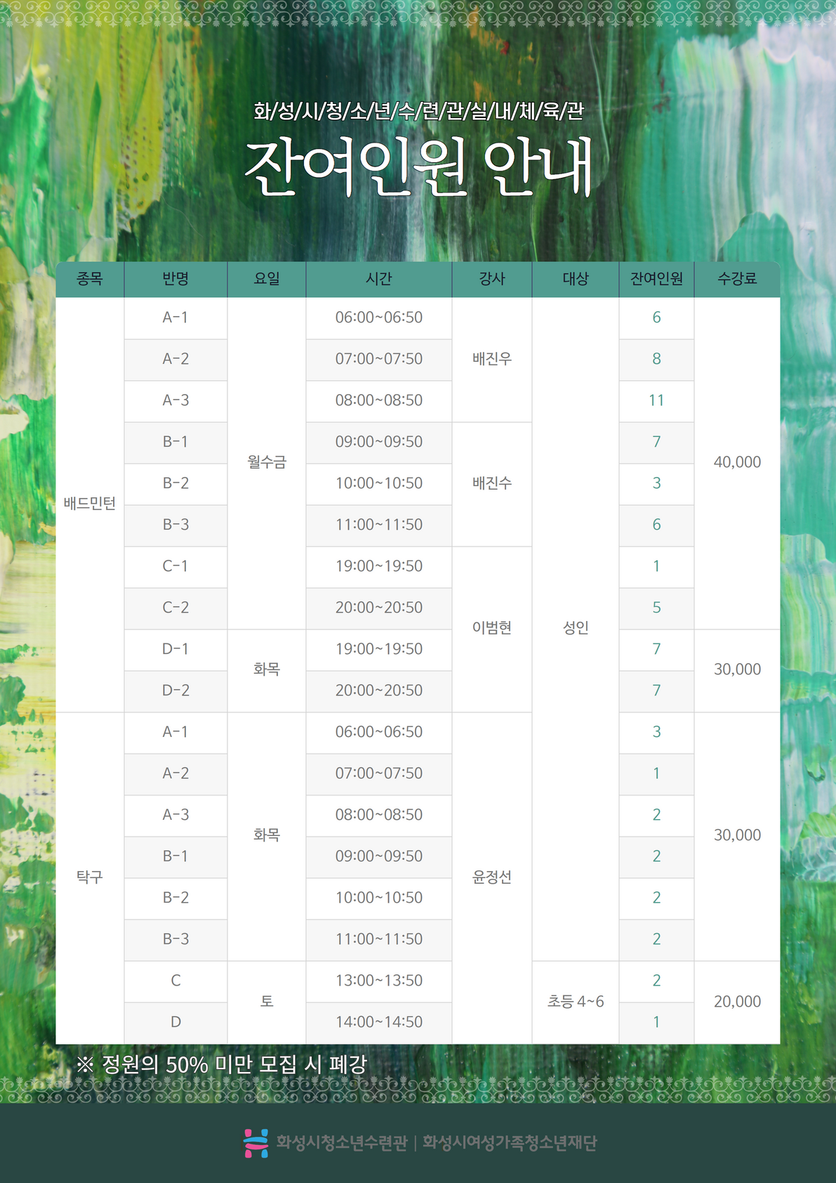| 제목 | [화성시청소년수련관] 실내체육관 9월 신규 및 기존반 추가접수 안내 | ||