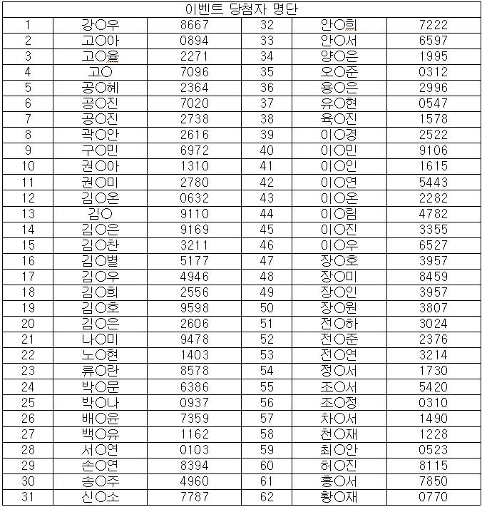 | 첨부 | 파일 아이콘하반기 이용자 만족도 조사 이벤트 당첨자 명단.jpg (177.24KB)다운로드 아이콘 | ||