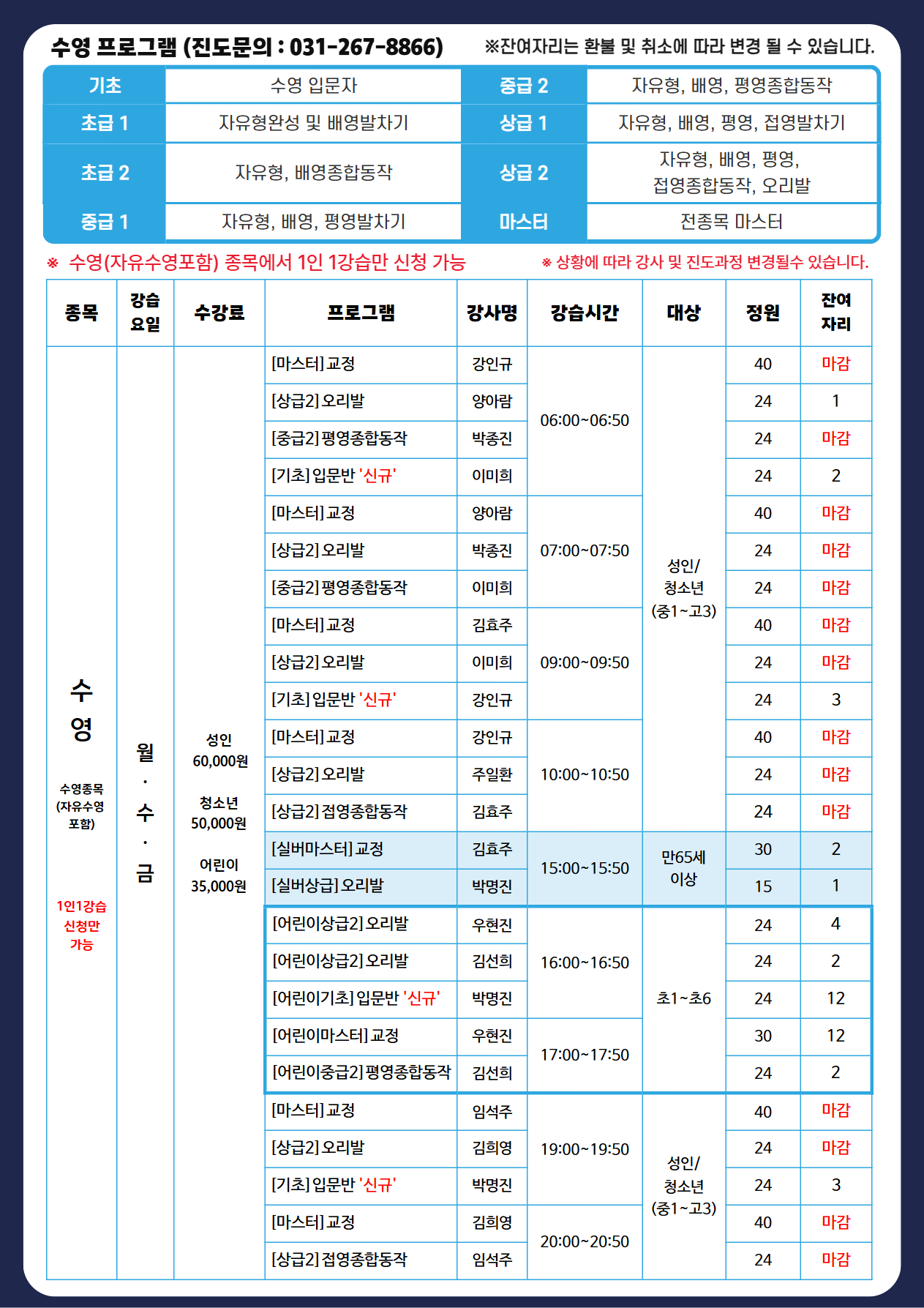 | 제목 | 2026년 5월 스포츠프로그램 신규강습 및 2차 잔여자리 등록안내 [수영, 아쿠아로빅, 헬스, 에어로빅, GX, 스피닝] | ||