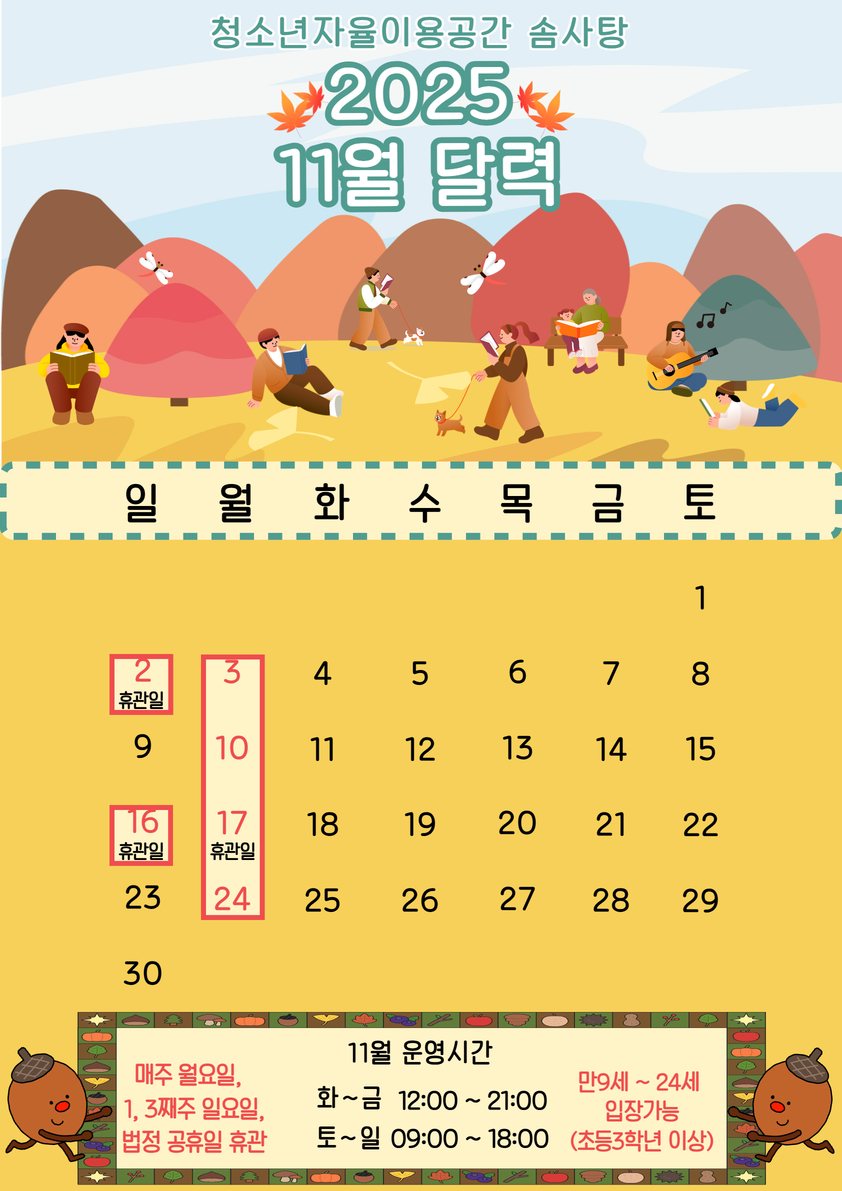 11월 운영시간 -평일(화~금요일): 12:00~21:00 -주말(토~일요일): 09:00~18:00 ▶ 매월 첫째주, 셋째주 일요일 / 매주 월요일 휴관입니다. ▶ 솜사탕 이용연령은 만9세(초3)~24세입니다. ▶ 솜사탕 내부의 청결유지를 위해 양말착용을 필수로 하고 있습니다. ▶솜사탕은 청소년자율이용공간으로 미취학아동과 초등학교1,2학년 그리고 성인(학부모님)의 출입이 불가함을 알려드립니다. 문의:031-267-8859 |