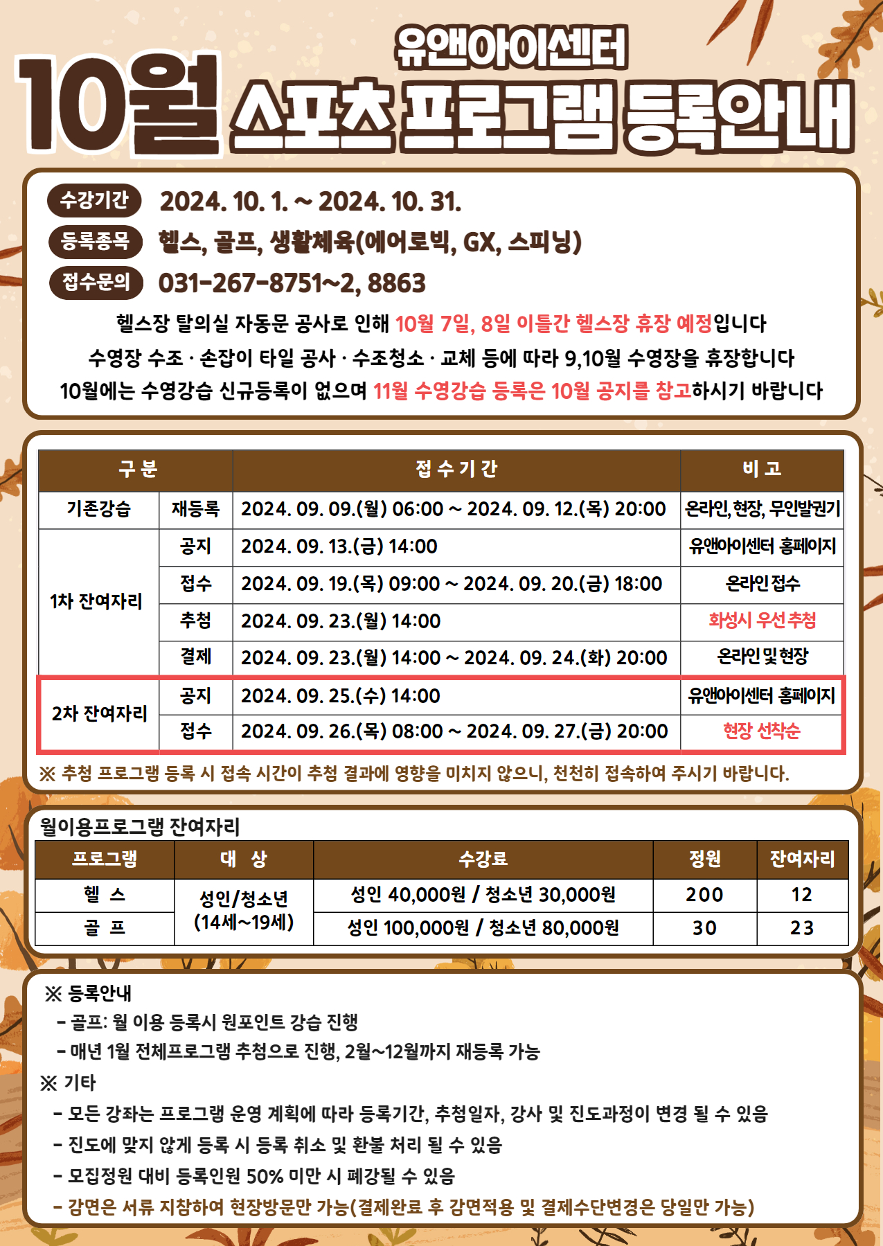 ▶등록종목 : 헬스, 골프, 에어로빅, GX, 스피닝 *수영장 공사로 수영,아쿠아로빅 신규 등록이 없습니다 *헬스장 탈의실 자동문 공사로 인해 10월 7일, 8일 헬스장 이틀간 휴장 예정입니다. ▶잔여자리 추가 접수기간 : 2024. 9. 26.(목) 08:00 ~ 2024. 9. 27.(금) 18:00 ▶접수 및 결제 : 현장 선착순 ※ 감면은 서류 지참하여 현장방문만 가능(결제완료 후 감면적용 및 결제수단변경은 당일만 가능) |