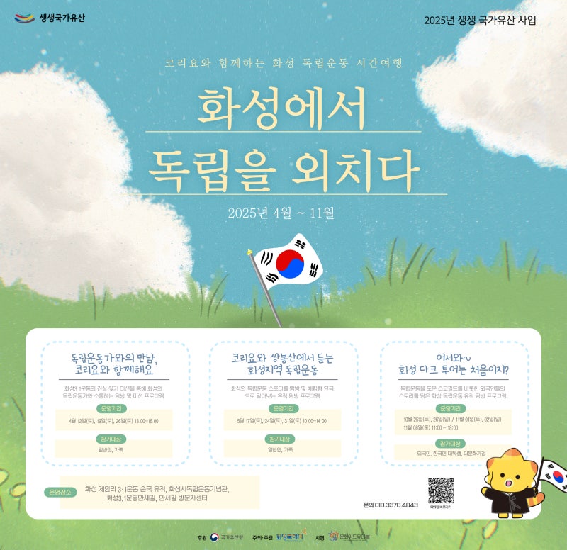 안녕하세요~ 화성특례시가 주관, 주최하고 문화위드유더봄에서 진행하는 프로그램 '코리요와 함께하는 화성 독립운동 시간여행(화성에서 독립을 외치다)'소개합니다 □ 운영기간: 2025. 4. ~ 11. □ 장 소: 화성 제암리 3.1운동 순국 유적 및 화성 3.1운동 만세길 등 □ 대 상: 일반인, 한국인 대학생 및 외국인, 다문화가정 □ 참여방법: 네이버 예약(선착순) □ 신청방법: 문화위드유더봄 검색 ▶ 플레이스 '예약' 클릭 ▶ 해당 프로그램 명 클릭 ▶ 날짜 선택 후 예약 진행 □ 문의전화: 031-5189-6542 □ 세부 프로그램 일정 - 독립운동가와의 만남, 코리요와 함께해요(*사전접수 마감) - 코리요와 쌍봉산에서 듣는 화성지역 독립운동 - 어서와~ 화성 다크투어는 처음이지?