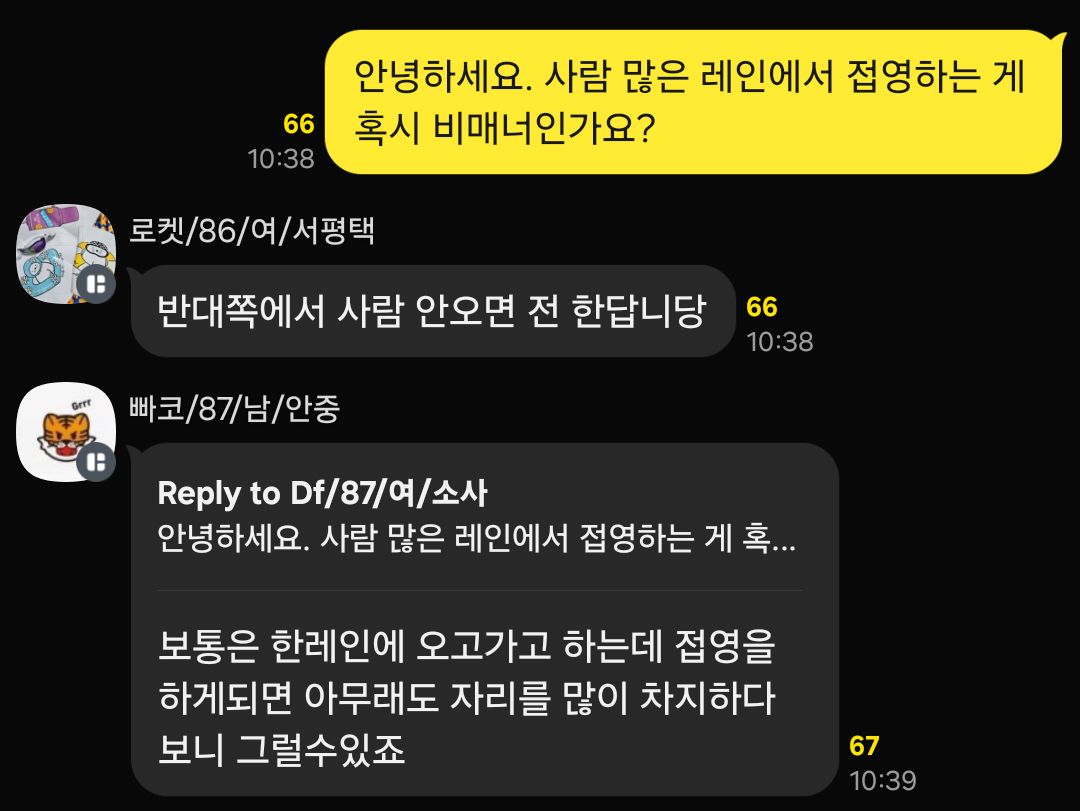 사람이 많이 이용하는 레인에서 단체로 접영하는 게 비매너임에도 불구하고 단체로 하면 죄책감이 1/n으로 줄어드는지 아무렇지 않게 중앙으로 팔이 넘어오며 해대는데 안전요원들은 되도록 사람 많을 때는 한팔 접영을 하라고 주의주면 좋겠네요. 수영하다가 손등이 부딪혔는데 안전요원한테 주의달라고 요청하니 되레 소리 지르지 마라는 얼토당토 않는 소리를 들었네요. |