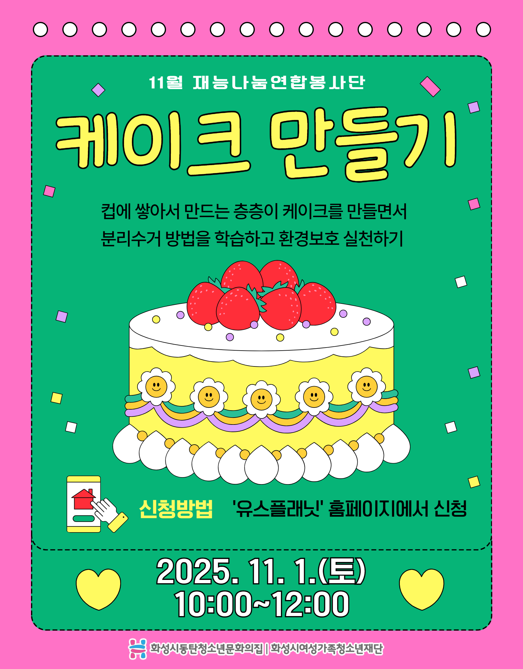 제목 [동탄청소년문화의집] 11월 어린이교실 : 케이크만들기 프로그램 운영 안내 작성일 2025년 10월 30일 10시 26분 조회수 259 첨부 파일 아이콘11월 누리보듬 홍보지.jpg (1.24MB)다운로드 아이콘 안녕하세요. 동탄청소년문화의집입니다. 이번주 토요일, 케이크 만들기 프로그램이 운영됩니다. - 활동일시: 2025. 11. 1.(토) 10:00~12:00- 활동장소: 동탄청소년문화의집 4층 가온누리- 활동내용: 컵에 쌓아서 만드는 층층이 케이크를 만들면서 분리수거 방법을 학습하고 환경보호 실천하기- 신청방법: 유스플래닛 홈페이지에서 아이 이름으로 가입 후 신청- 문의사항: 031-8058-2104 많은 관심과 참여 부탁드립니다. 감사합니다. 목록보기
