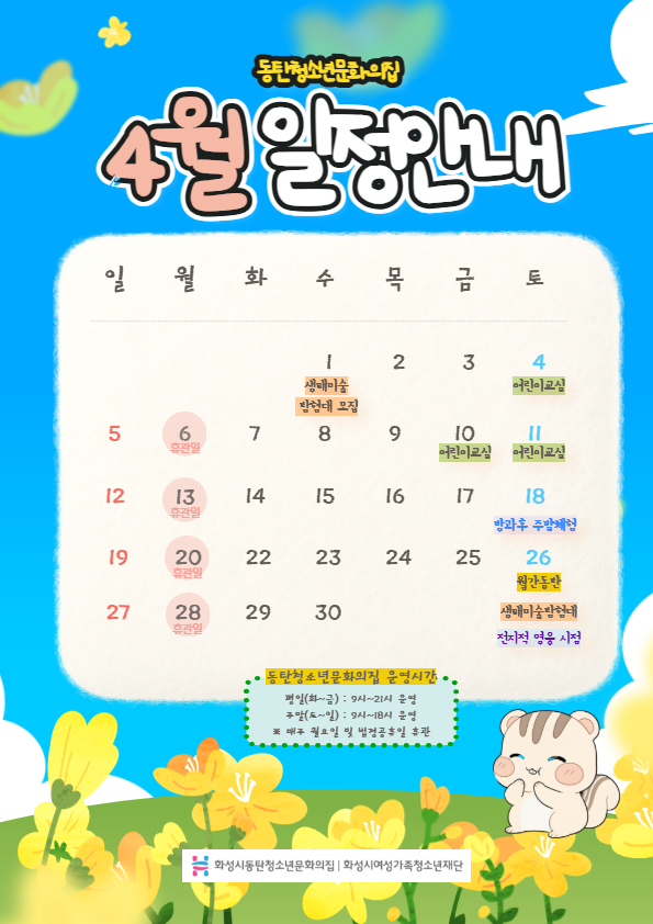 | 제목 | [동탄청소년문화의집] 4월 동탄청소년문화의집 일정 안내 | ||