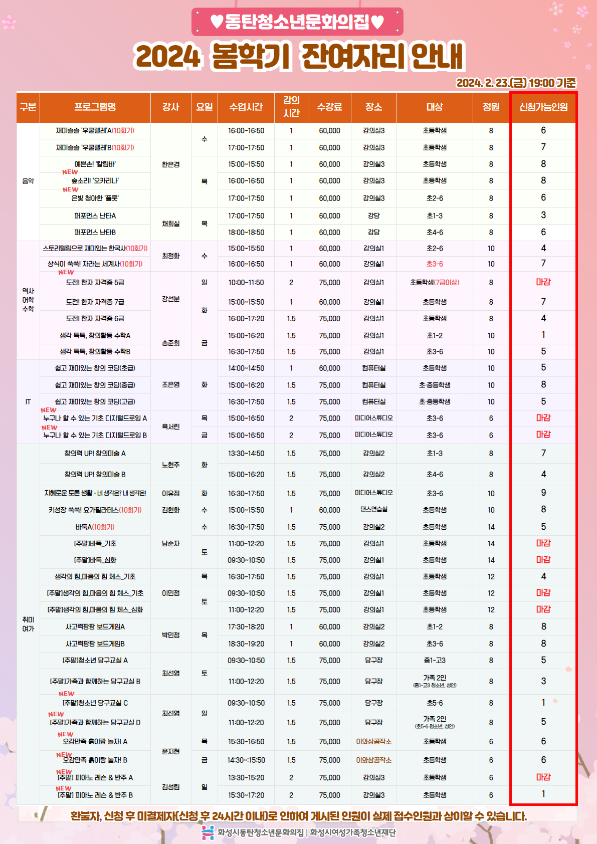2024. 2. 23.(금) 19시 기준 잔여자리 안내드립니다. 많은 관심 부탁드립니다.