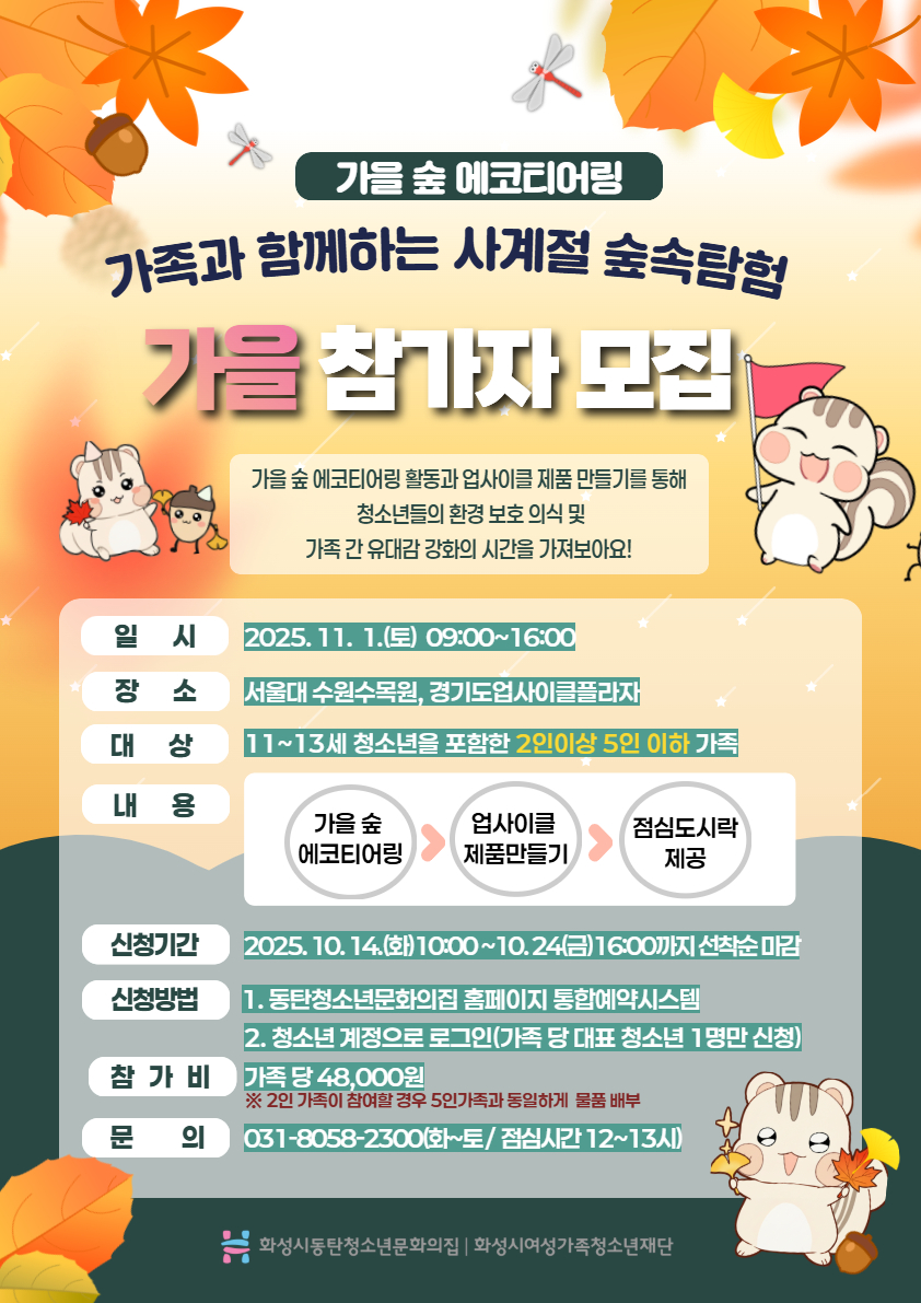 | 제목 | [동탄청소년문화의집] 가족과 함께하는 사계절 숲속탐험 '가을' 참가자 대모집~!! | ||