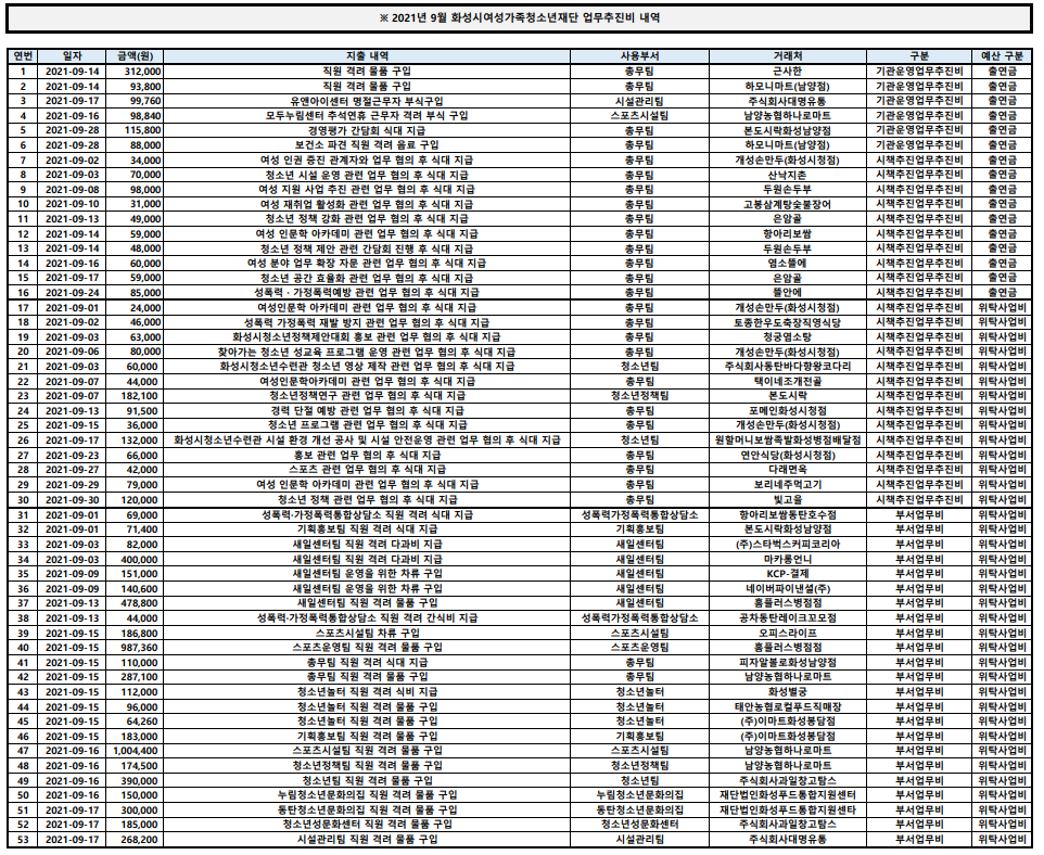 제목 업무추진비 2021년 9월 업무추진비 내역 작성일 2021년 10월 22일 11시 35분 조회수 397 첨부 파일 아이콘2021년 9월 업무추진비 내역.pdf (113.11KB)다운로드 아이콘 파일 아이콘2021년 9월 업무추진비 내역.png (524.89KB)다운로드 아이콘 목록보기