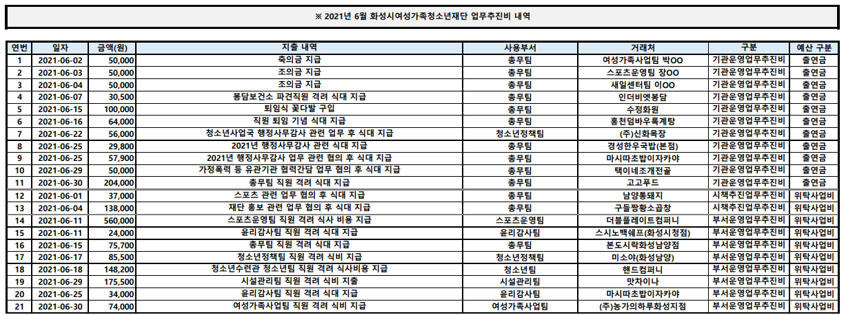 제목 업무추진비 2021년 6월 업무추진비 내역 작성일 2021년 7월 20일 10시 43분 조회수 480 첨부 파일 아이콘2021년 6월 업무추진비 내역.pdf (77.72KB)다운로드 아이콘 파일 아이콘2021년 6월 업무추진비 내역.png (283.56KB)다운로드 아이콘 목록보기
