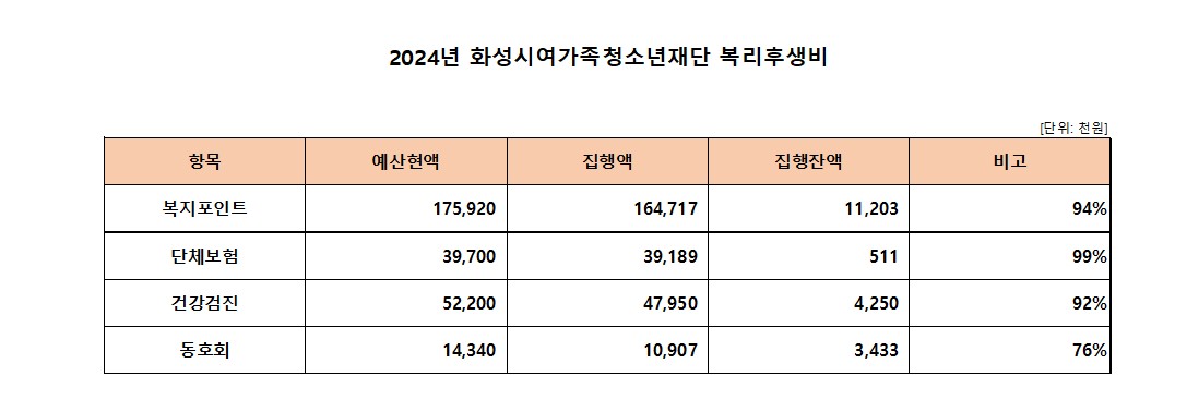 | 제목 | 복리후생비 2024년 화성시여성가족청소년재단 복리후생비 집행내역 | ||