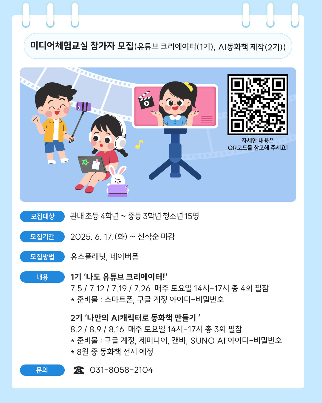 ○ 미디어체험교실 참가자 모집(유튜브 크리에이터(1), AI동화책 제작(2)) (청소년)