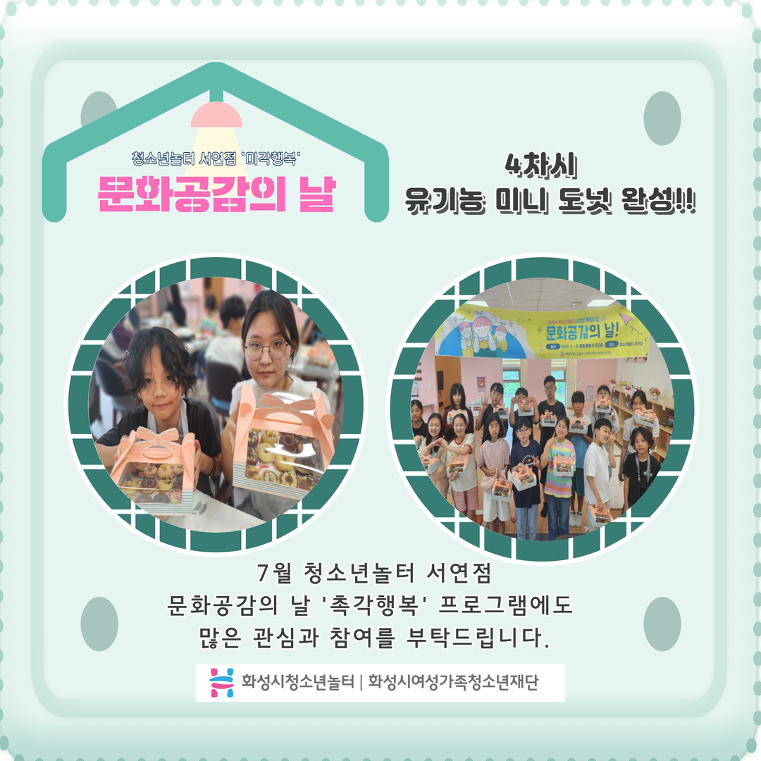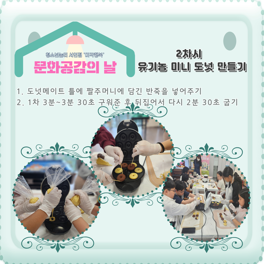 1. 화성시청소년놀터 서연점 6월 문화공감의 날 일시: 2024. 6. 8.(토) 10:00~12:00 대상: 화성시 관내 11세~16세 청소년 16명 내용: 달콤퐁당 유기농 미니 도넛 만들기 장소: 화성시청소년놀터 서연점 2. 1차시 안전교육 & 강사님 소개 안전교육 중 / 강사님께 주의사항 듣기 3. 2차시 유기농 미니 도넛 만들기 도넛메이트 틀에 짤주머니에 담긴 반죽을 넣어주기 1차 3분~3분 30초 구워준 후 뒤집어서 다시 2분 30초 굽기 4. 3차시 수제 미니 도넛 꾸미기 구운 미니 도넛 위에 다양한 토핑과 색깔펜으로 꾸며주기 수제 유기농 미니 도넛 완성!! 5. 4차시 유기농 미니 도넛 완성!! 완성!! 7월 청소년놀터 서연점 문화공감의 날 ‘촉각행복’ 프로그램에도