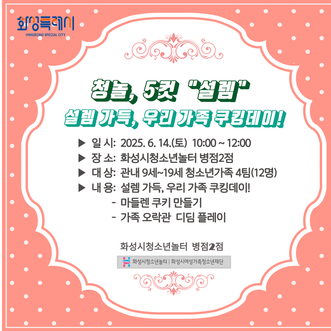 <1면> 화성시청소년놀터 병점2점 청놀,5컷 설렘 설렘 가득, 우리 가족 쿠킹데이! ▶ 일시: 2025. 6. 14.(토) 10:00 ~ 12:00 ▶ 대상: 화성시 관내 9세~15세 청소년 가족 4팀(12명) ▶ 내용: 설렘 가득, 우리 가족 쿠킹데이! - 마들렌 쿠키만들기 - 가족오락관 디딤 플레이 ▶ 장소: 화성시청소년놀터 병점2점