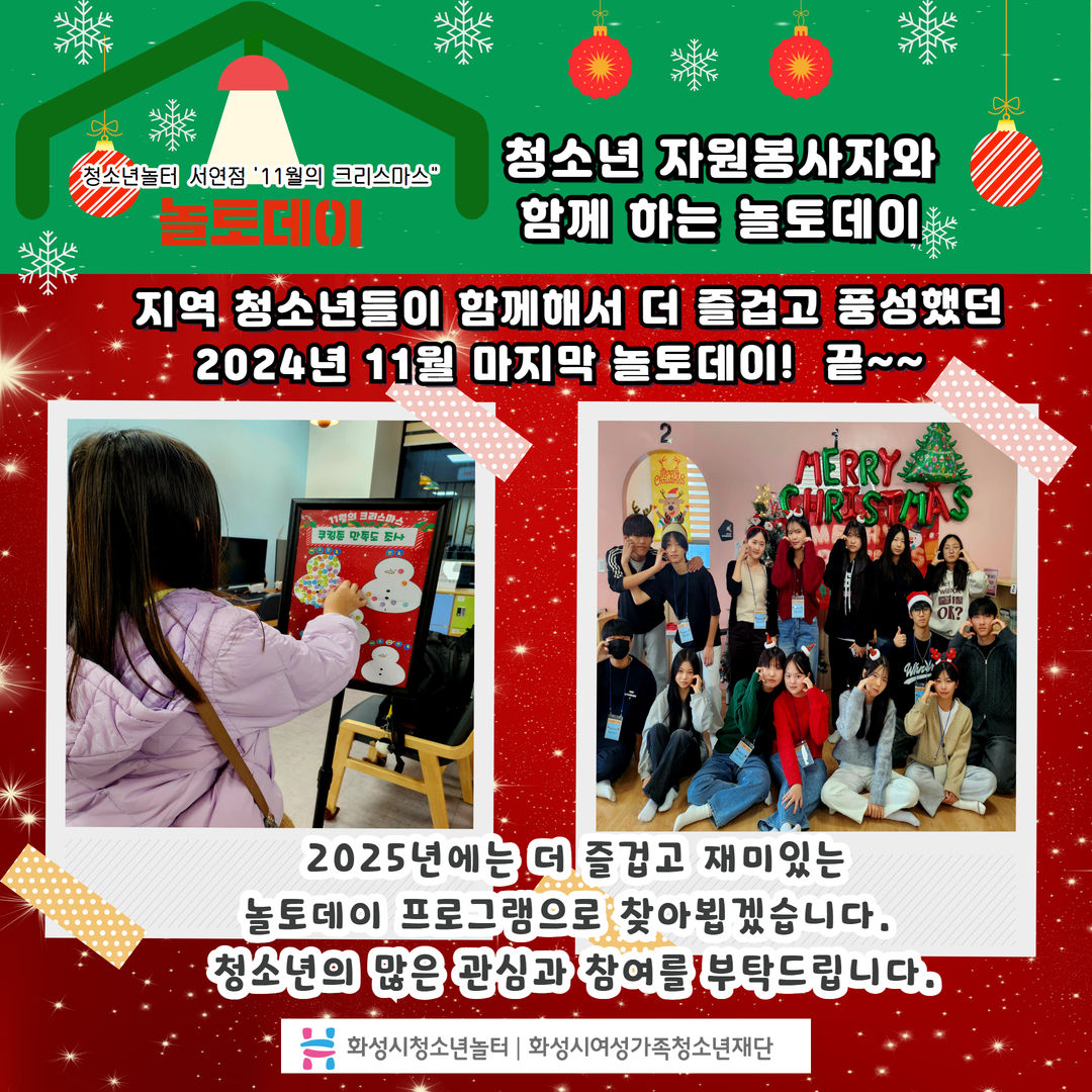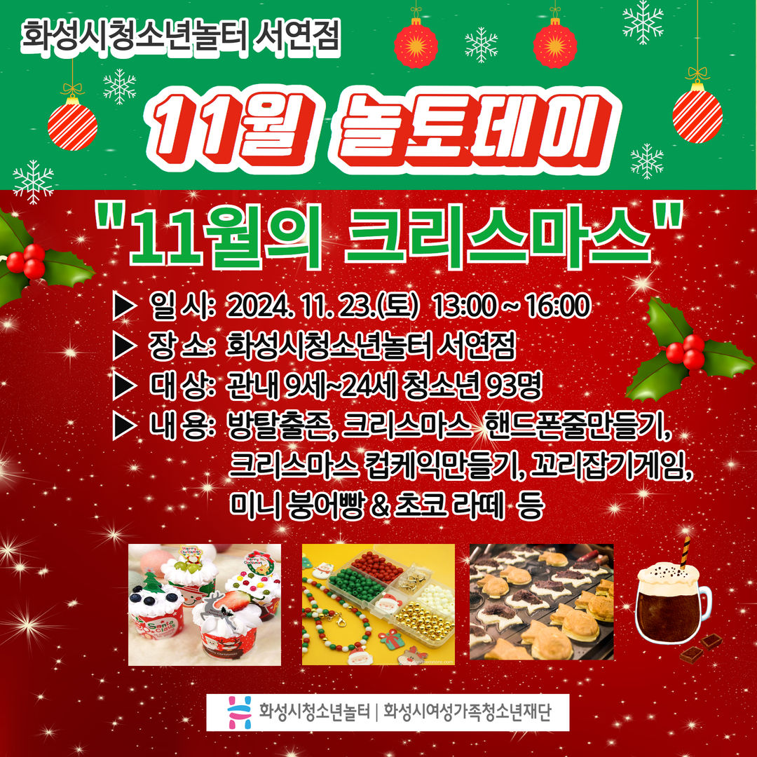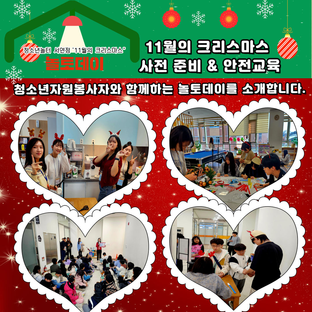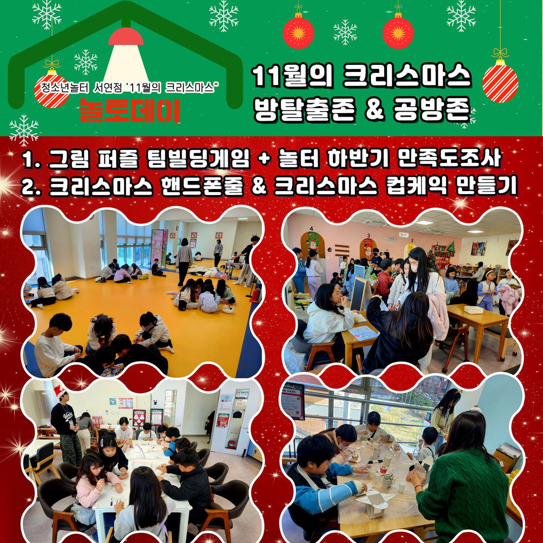 1. 청소년놀터 서연점 11월 놀토데이 "11월의 크리스마스" 일시: 2024.11.23.(토) 13:00~16:00 장소: 청소년놀터 서연점 대상: 관내 9세~24세 청소년 내용: 방탈출존, 크리스마스 핸드폰줄만들기, 크리스마스 컵케익만들기, 꼬리잡기게임, 미니 붕어빵 & 초코 라떼 등 2. 11월의 크리스마스 사전 준비 & 안전교육 청소년자원봉사자와 함께하는 놀토데이를 소개합니다. 3. 11월의 크리스마스 방탈출존 & 공방존 1. 그림 퍼즐 팀빌딩게임+놀터 하반기 만족도 조사 2. 크리스마스 핸드폰줄 & 크리스마스 컵케익 만들기 4. 11월의 크리스마스 게임존 & 쿠킹존 1. 꼬리잡기 배틀전 & 병뚜껑 멀리보내기 게임 2. 모든 미션 완수 시 미니 붕어빵 & 초코 라떼를 받아요! 5. 청소년자원봉사자와 함께하는 놀토데이 지역 청소년들이 함께해서 더 즐겁고 풍성한 2024년 11월 마지막 놀토데이! 끝~~~ 2025년에는 더 즐겁고 재미있는 놀토데이 프로그램으로 찾아뵙겠습니다. 청소년의 많은 관심과 참여를 부탁드립니다.