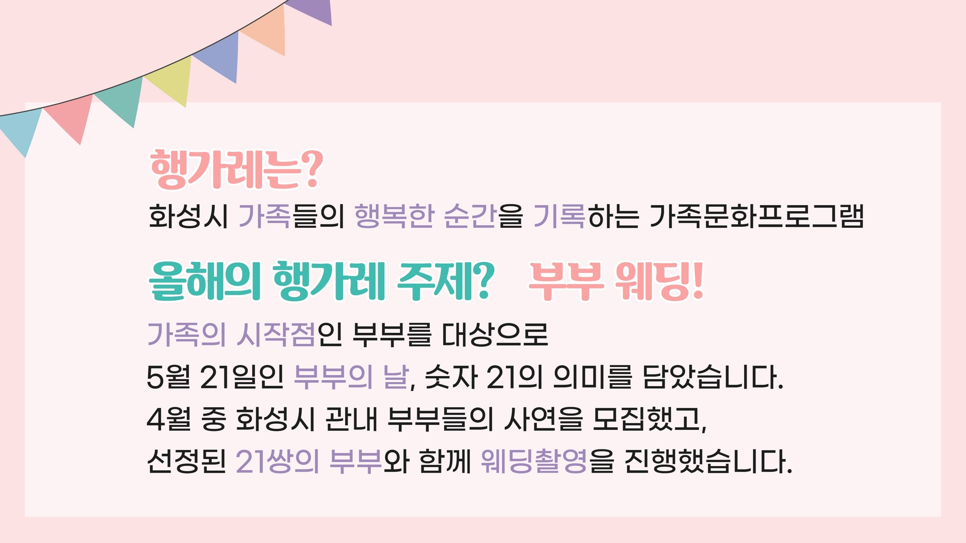올해의 행가레 주제? 부부 웨딩! 가족의 시작점인 부부를 대상으로 5월 21일인 부부의 날, 숫자 21의 의미를 담았습니다. 4월 중 화성시 관내 부부들의 사연을 모집했고, 선정된 21쌍의 부부와 함께 웨딩촬영을 진행했습니다.