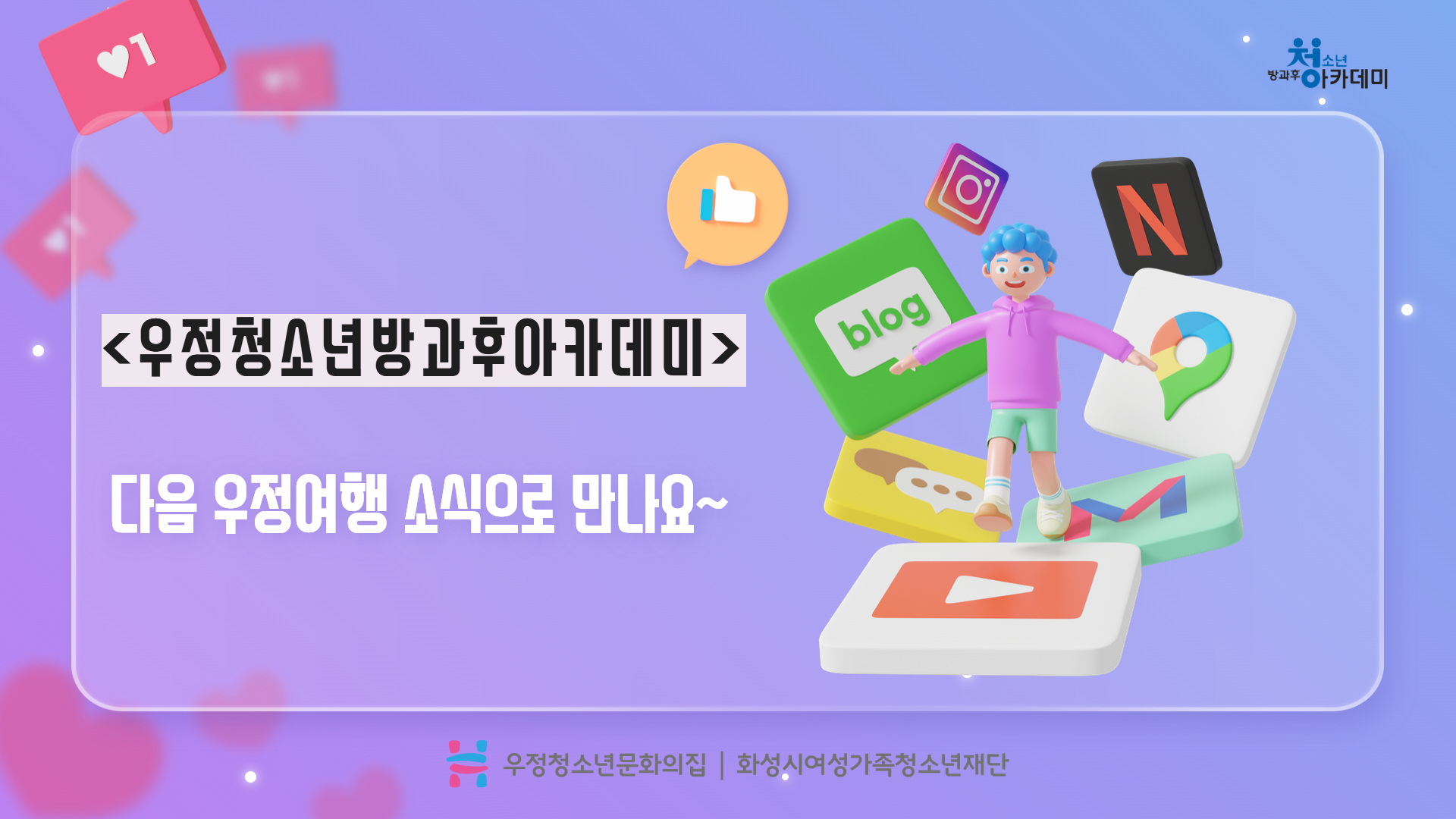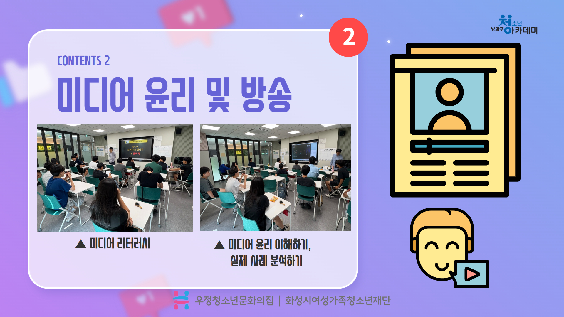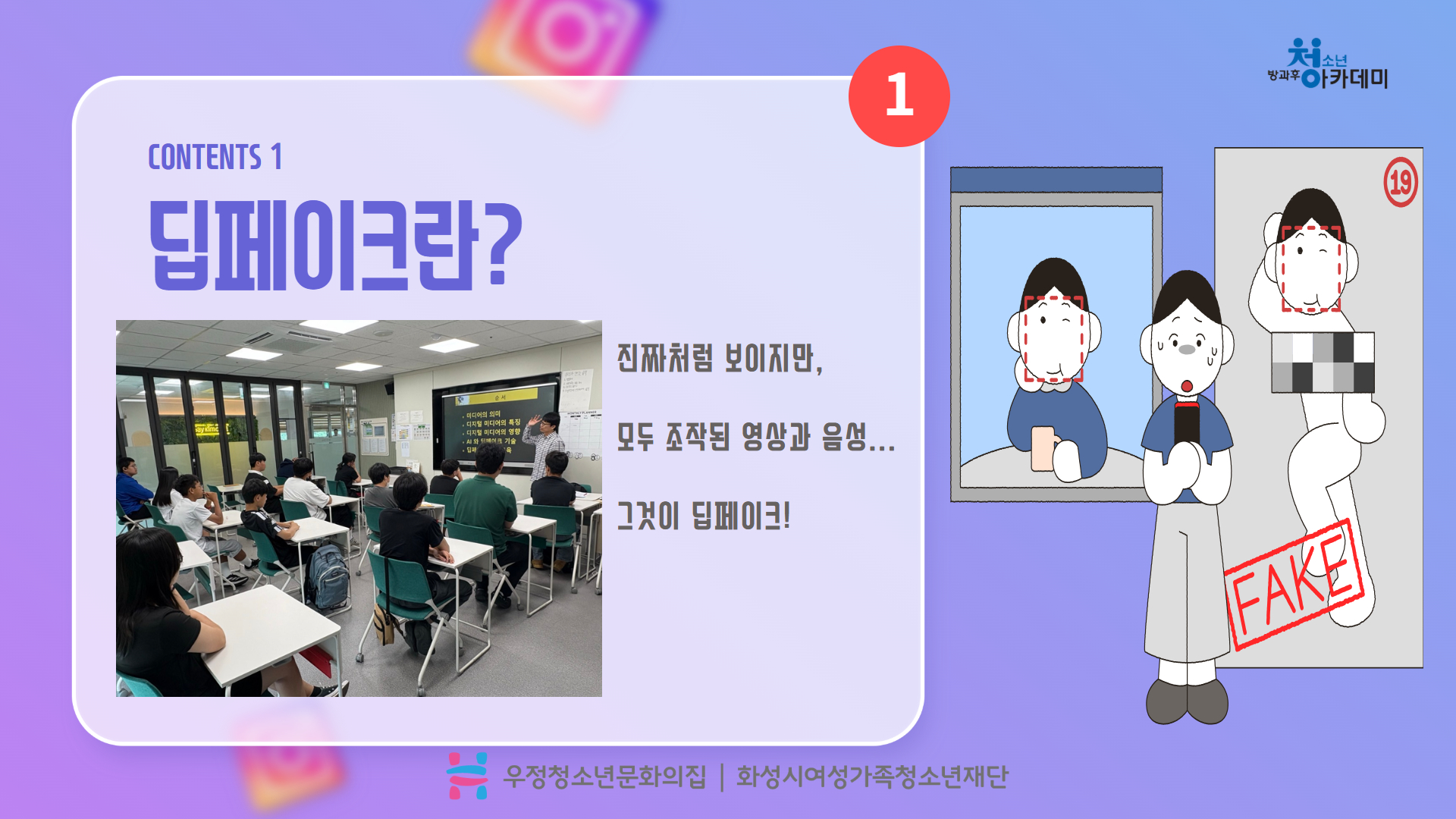 안녕하세요. 우정청소년문화의집 청소년방과후아카데미 우정여행입니다. 여름방학을 맞이하여 청소년 지역연계 프로그램이 활발하게 운영되고 있습니다^_^ 그 중 7월에 2회기(2시간*2회기)로 진행된 <2025 찾아가는 미디어 스쿨>을 카드뉴스로 소개하려합니다. <2025 찾아가는 미디어 스쿨>은 화성시문화관광재단 화성시미디어센터에서 15개 기관을 모집하여 미디어리터러시 교육 프로그램을 지원하는 프로그램으로, 우정청소년문화의집 방과후아카데미가 15개 기관 중 1개 기관으로 선정되었습니다^_^!! 7월 25일(금)과 28일(월) 2회기에 걸쳐 진행된 프로그램에서는 전문 강사 선생님이 오셔서 딥페이크, 미디어 윤리 및 방송, AI와 인공지능 등의 미디어 리터러시 자료와 프로그램을 제공해주셨습니다. 카드뉴스로 소식 알아볼까요? |