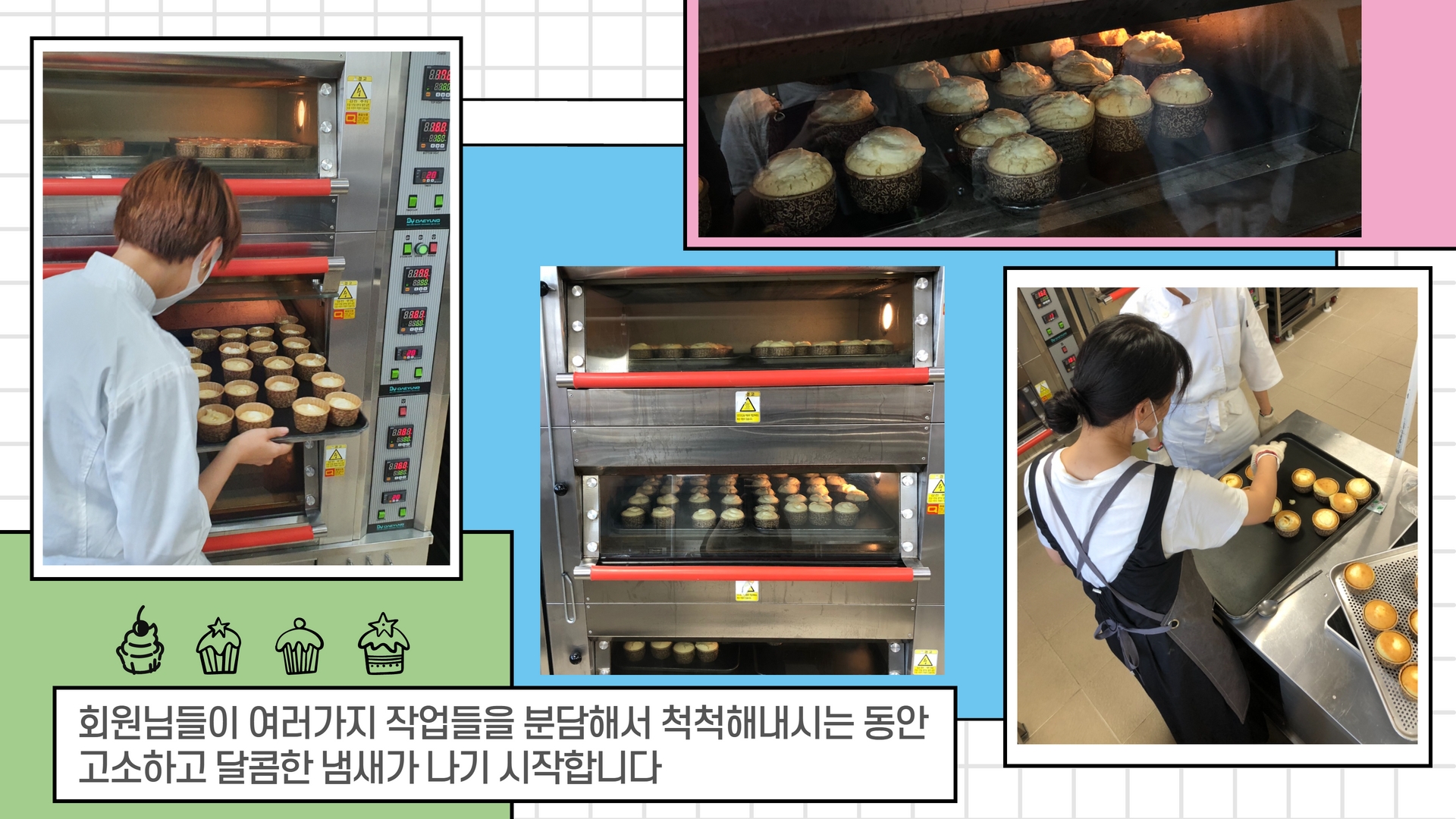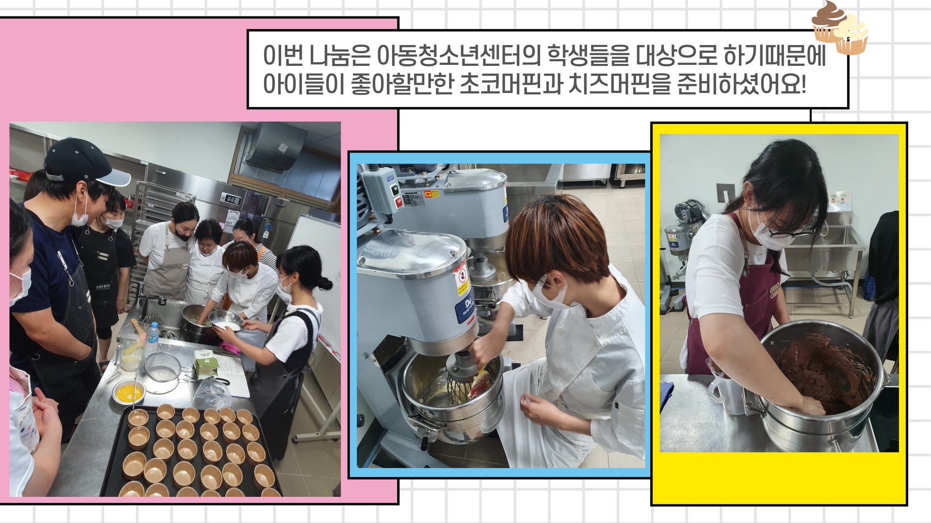 이른아침, 오자매빵수다 동아리 회원들이 재능기부를 위해 모두누림센터에 모였습니다! 이번 나눔은 아동청소년센터의 학생들을 대상으로 하기때문에 아이들이 좋아할만한 초코머핀과 치즈머핀을 준비하셨어요! 회원님들이 여러가지 작업들을 분담해서 척척해내시는 동안 고소하고 달콤한 냄새가 나기 시작합니다 각각의 머핀 속에는 치즈크림과 초코크림이 가득해요. 동아리 회원들의 정성과 사랑이 듬뿍 담긴 수제 머핀! 받는 친구들이 정말 좋아할 것 같아요♡ 이렇게 포장까지 마친 머핀은 남양아동청소년센터의 학생들에게 나눔했습니다. 저희 동아리의 재능기부활동은 앞으로도 계속됩니다. :)