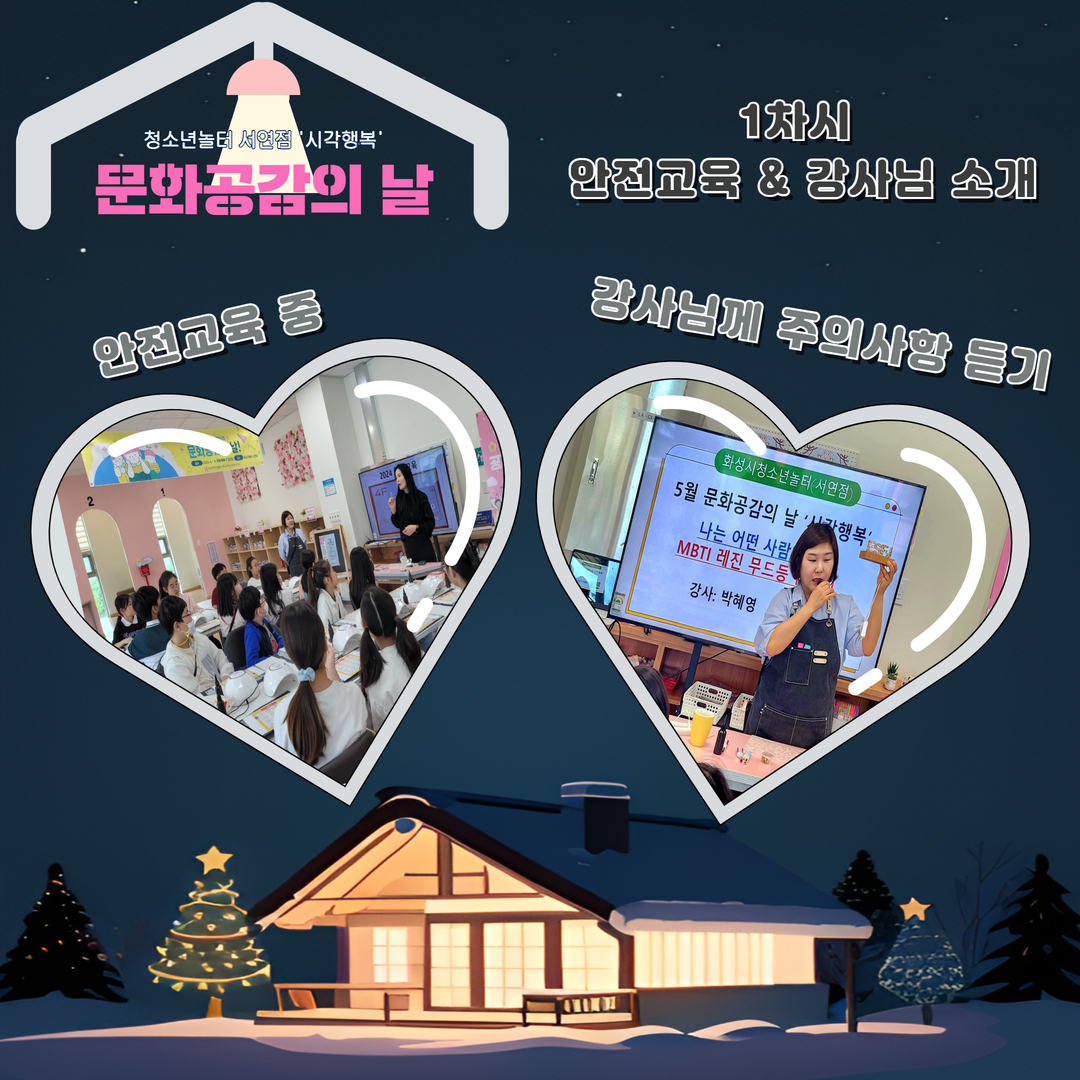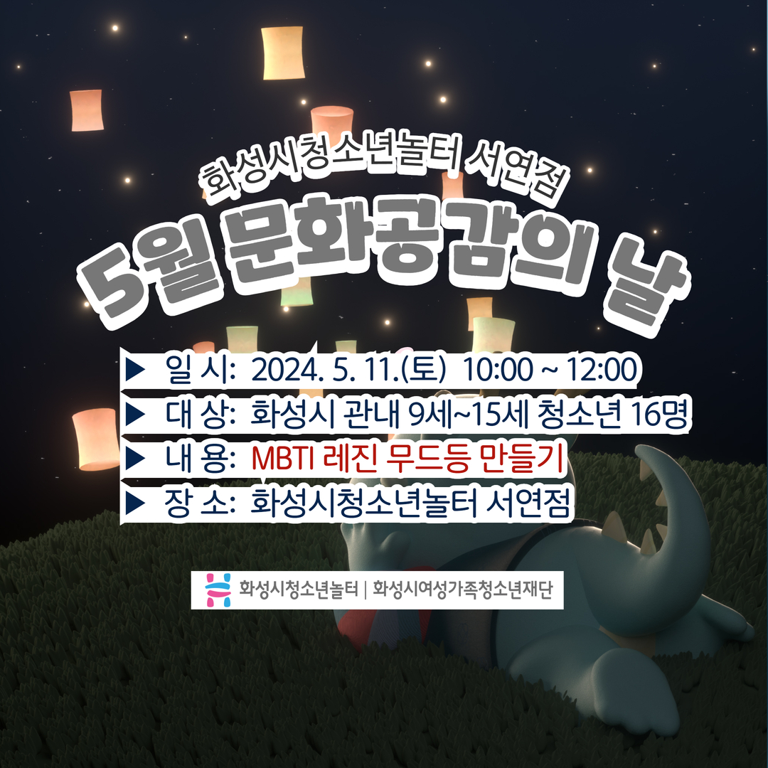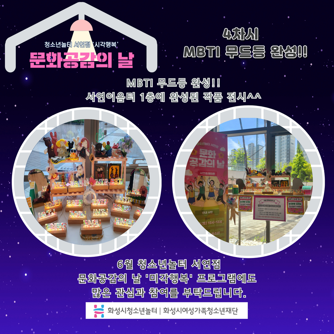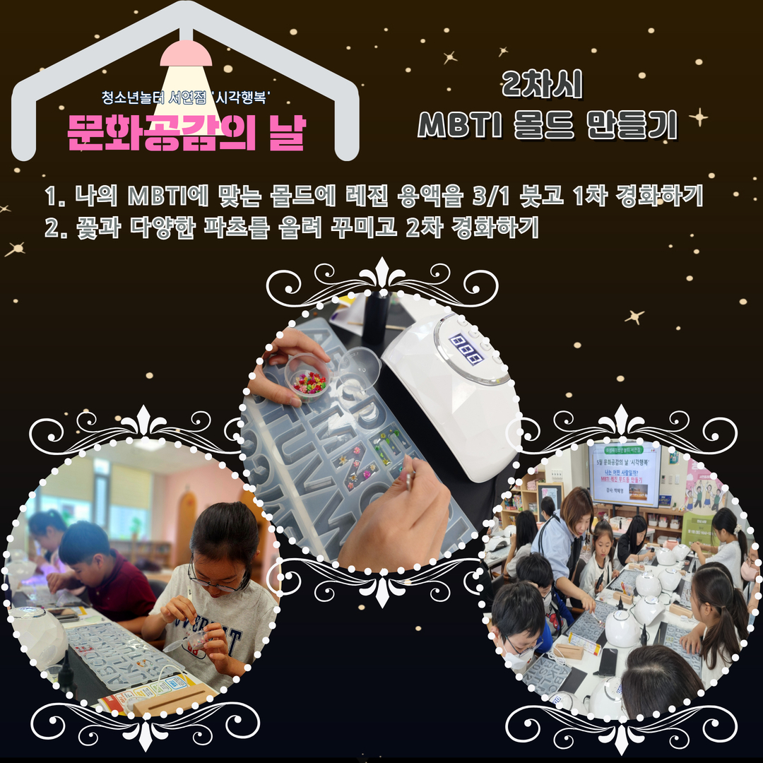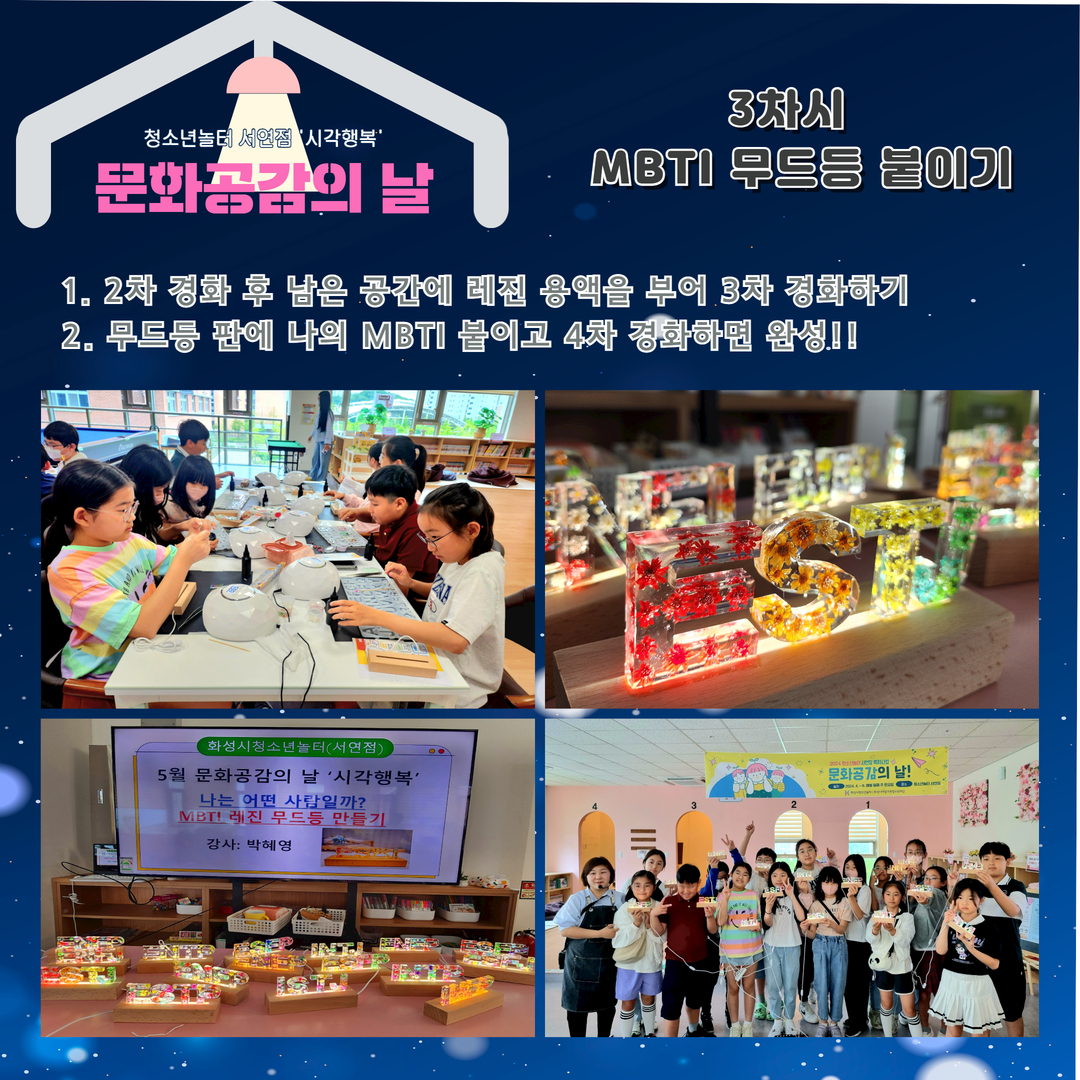 1. 화성시청소년놀터 서연점 5월 문화공감의 날 일시: 2024. 5. 11.(토) 10:00~12:00 대상: 화성시 관내 9세~15세 청소년 16명 내용: MBTI 레진 무드등 만들기 장소: 화성시청소년놀터 서연점 2. 1차시 안전교육 & 강사님 소개 안전교육 중 / 강사님께 주의사항 듣기 3. 2차시 MBTI 몰드 만들기 나의 MBTI에 맞는 몰드에 레진 용액을 3/1 붓고 1차 경화하기 꽃과 다양한 파츠를 올려 꾸미고 2차 경화하기 4. 3차시 MBTI 무드등 붙이기 2차 경화 후 남은 공간에 레진 용액을 부어 3차 경화하기 무드등 판에 나의 MBTI 붙이고 4차 경화하기 5. 3차시 MBTI 무드등 완성!! 서연이음터 1층에 완성된 작품 전시^^ 6월 청소년놀터 서연점 문화공감의 날 ‘미각행복’ 프로그램에도