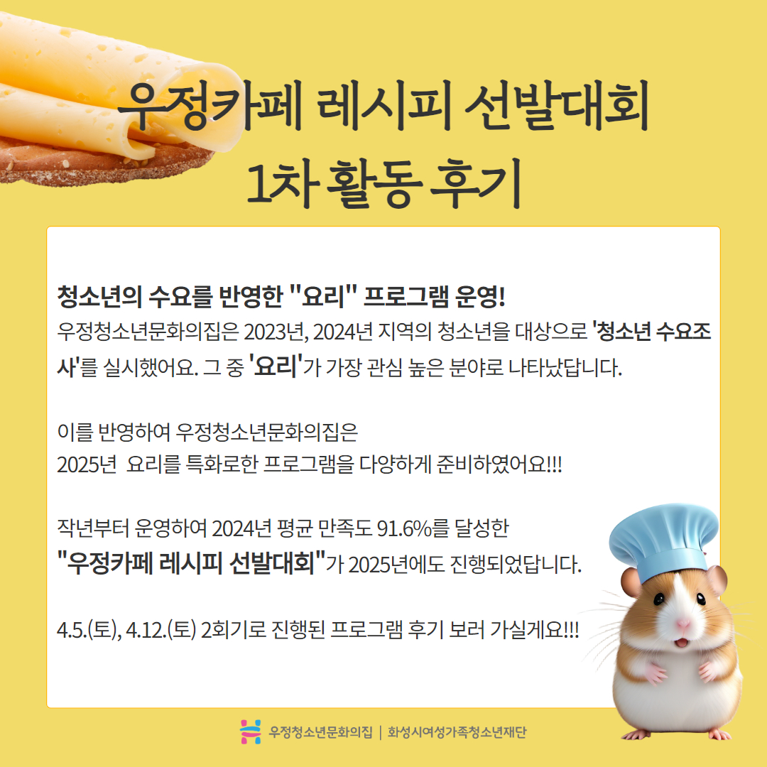 이를 반영하여 우정청소년문화의집은 2025년 요리를 특화로한 프로그램을 다양하게 준비하였어요!!!