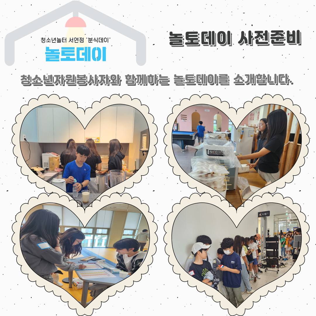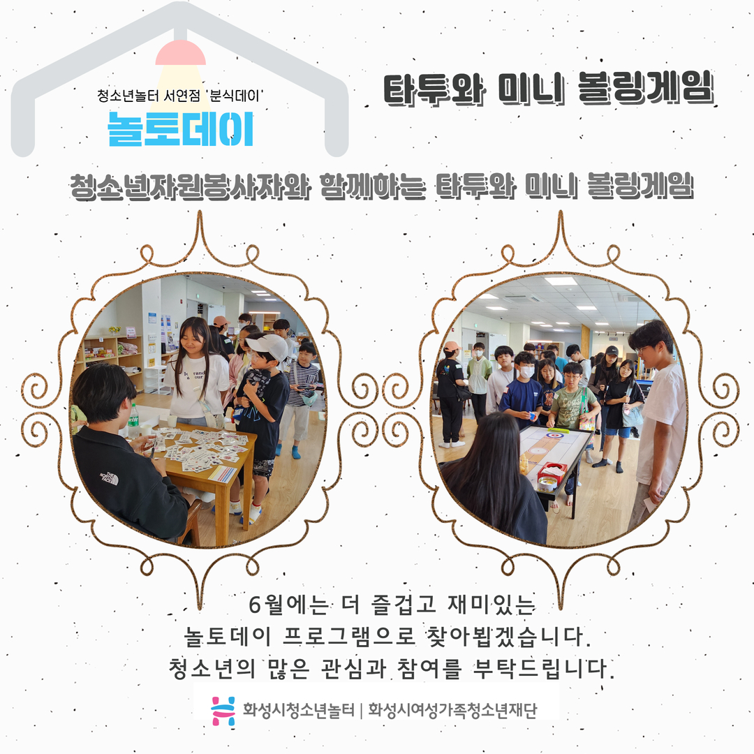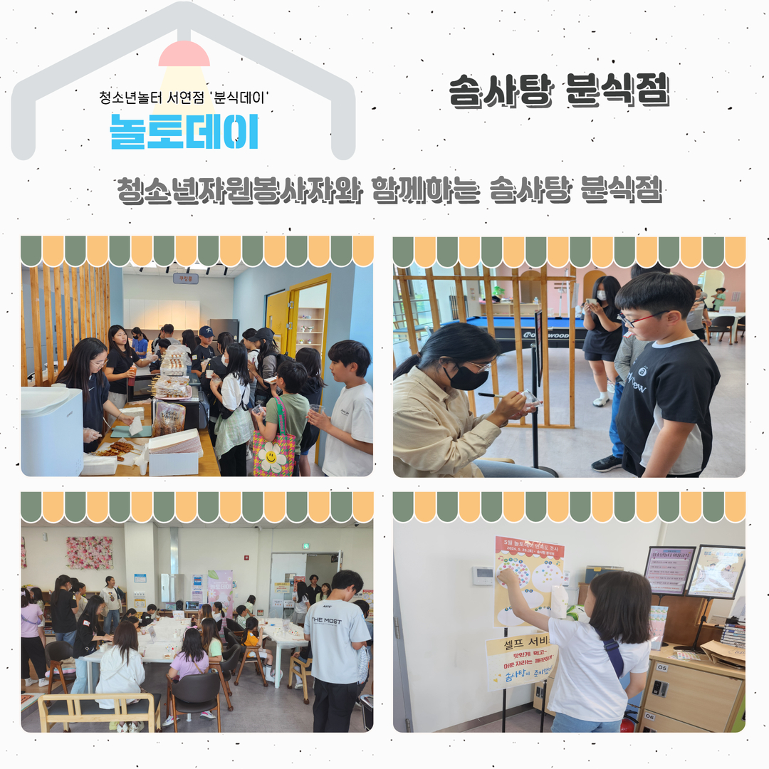1. “분식데이” 화성시청소년놀터 서연점 5월 놀토데이 일시: 2024. 5. 25.(토) 13:00~16:00 대상: 화성시 관내 9세~24세 청소년 140명 내용: 컵볶이, 소떡소떡, 닭꼬치, 음료 장소: 화성시청소년놀터 서연점 2. 놀토데이 사전준비 청소년자원봉사자와 함께하는 놀토데이를 소개합니다. 3. 방탈출존 청소년자원봉사자와 함께하는 방탈출게임 4. 솜사탕분식점 청소년자원봉사자와 함께하는 솜사탕분식점 5. 타투와 미니 볼링게임 청소년자원봉사자와 함께하는 타투와 미니 볼링게임 6월에는 더 재미있고 즐거운 놀토데이 프로그램 찾아뵙겟습니다.