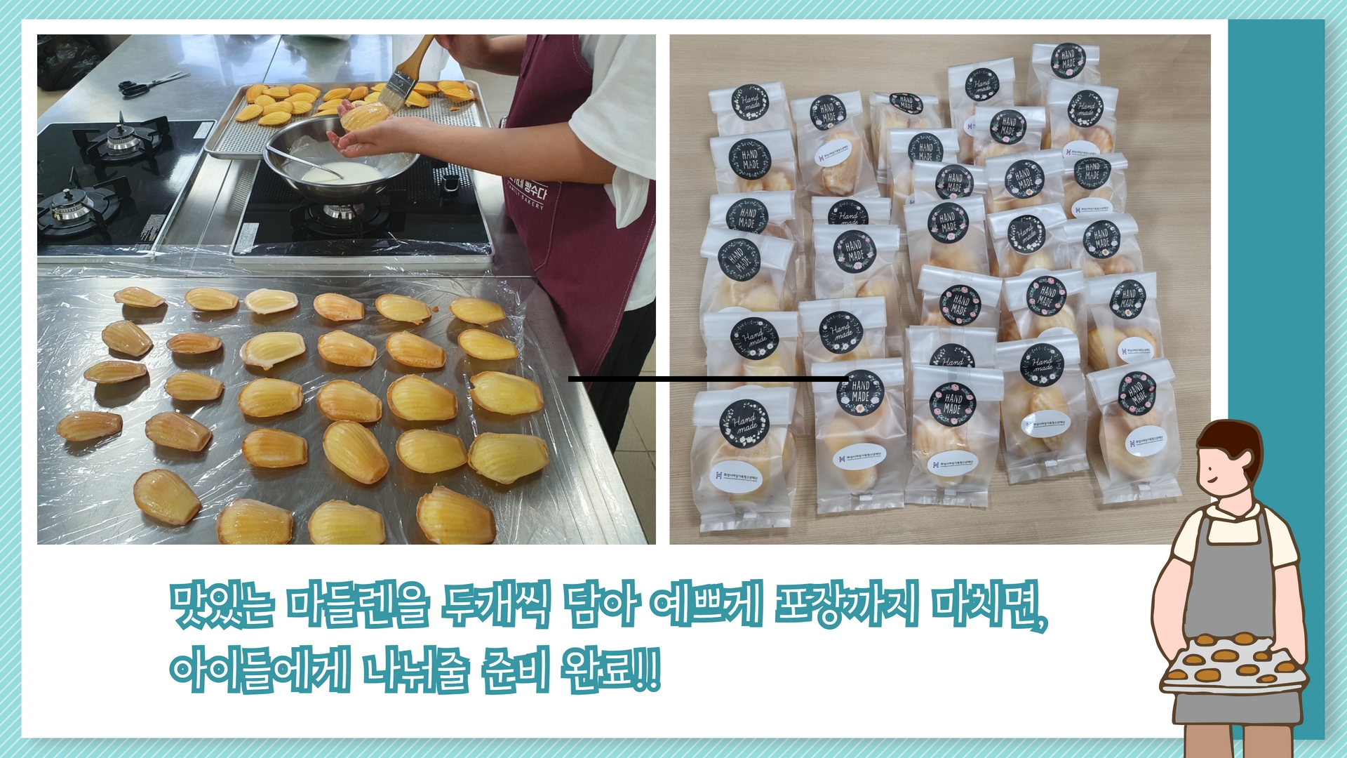 맛있는 마들렌을 두개씩 담아 예쁘게 포장까지 마치면, 아이들에게 나눠줄 준비 완료!!