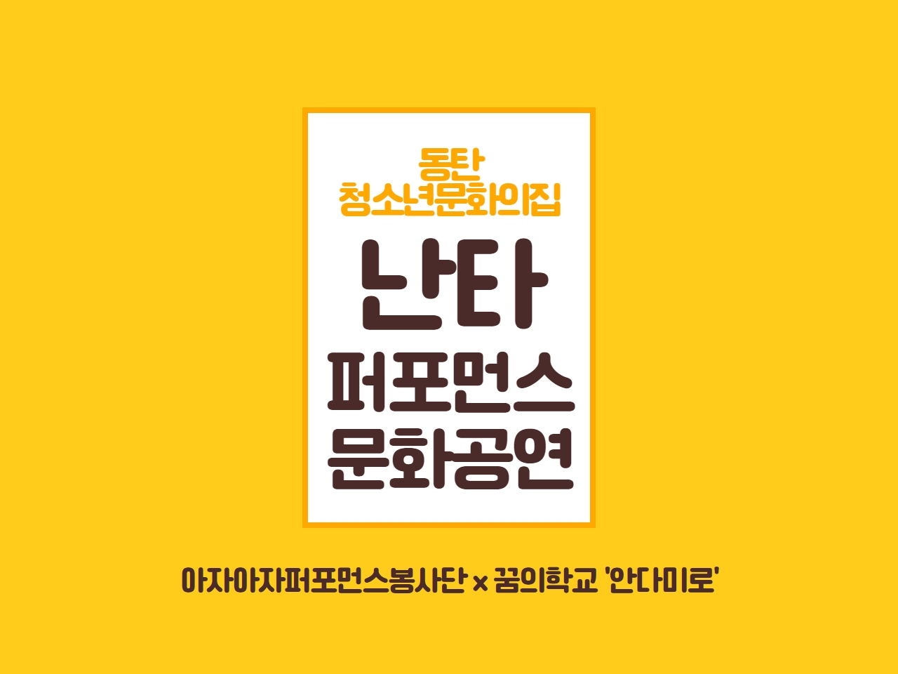 2021 동탄청소년문화의집 난타 퍼포먼스 문화공연 재단에 바랍니다 상세 운영센터 동탄청소년문화의집 등록일 2021년 11월 16일 16시 20분 조회수 435 코로나19로 인하여 공연을 즐기기 어려운 요즘!동탄청소년문화의집에서 온라인 공연을 준비했습니다. 아자아자 퍼포먼스 봉사단과 꿈의학교 '안다미로' 청소년이 함께한 공연입니다. 신나고! 즐거운! 난타 퍼포먼스 문화공연 시청하시고 행복하시길 바라겠습니다. 감사합니다~ + 계정에 들어가시면 아리랑, Butter 공연도 있으니 많은 시청 바랍니다! 파일 아이콘제목을 입력하세요 (22).jpg (127.55KB)다운로드 아이콘 목록보기