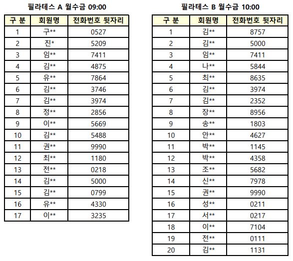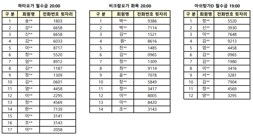 나. 요가: 힐링요가, 베이직요가, 아쉬탕가요가A, 아쉬탕가요가B