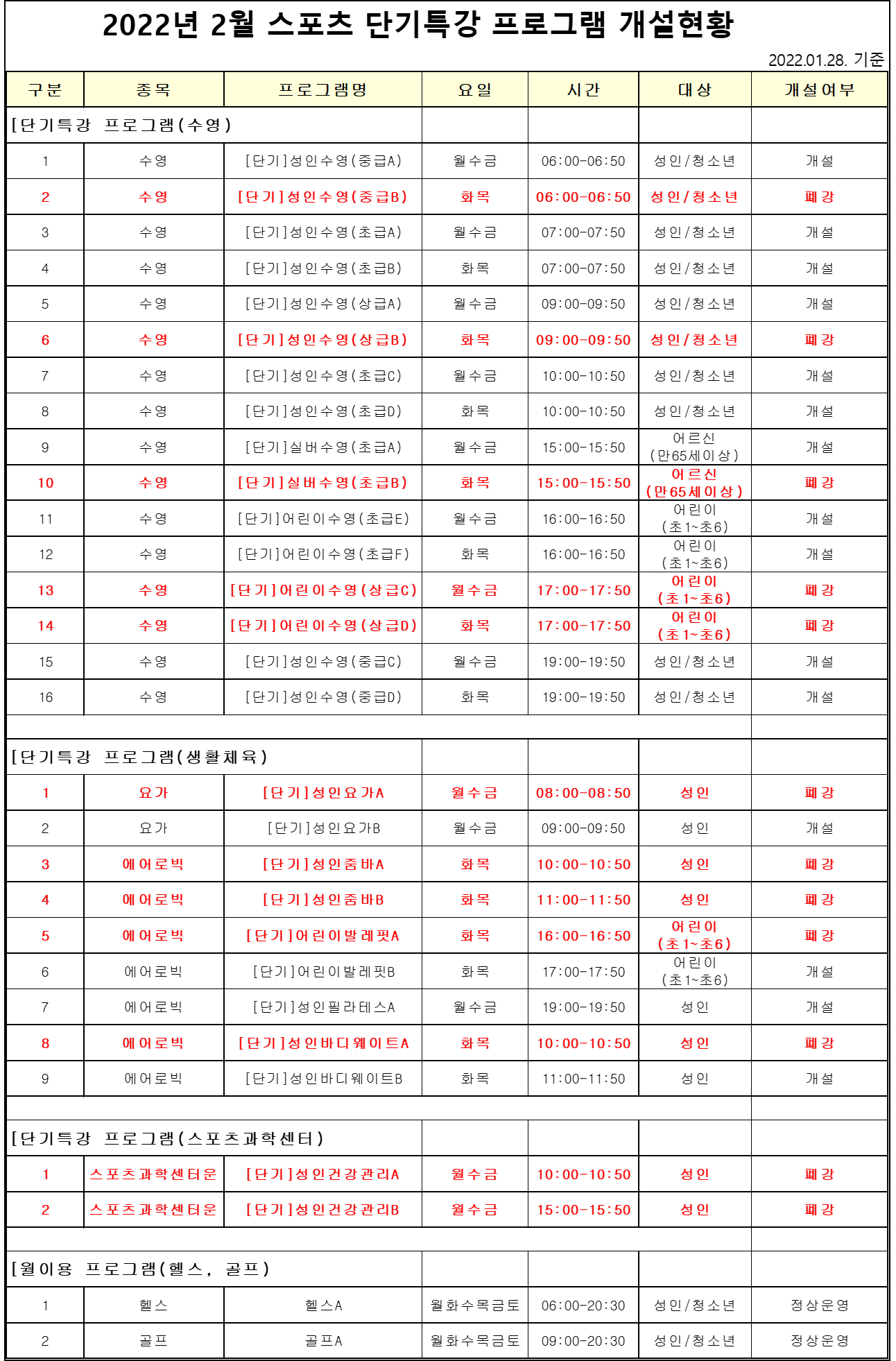 20222월 스포츠 단기특강 프로그램 개강을 다음과 같이 안내해드립니다.