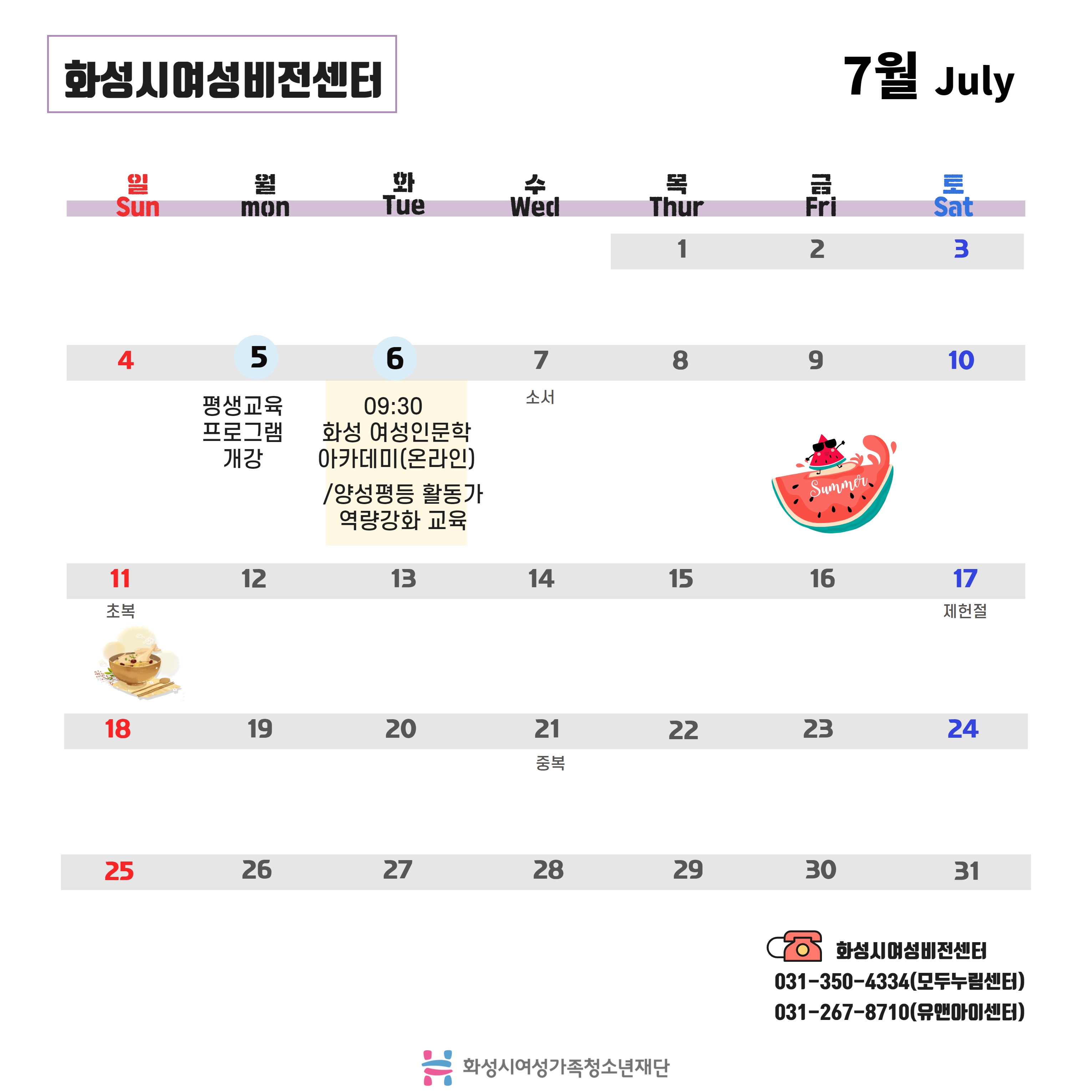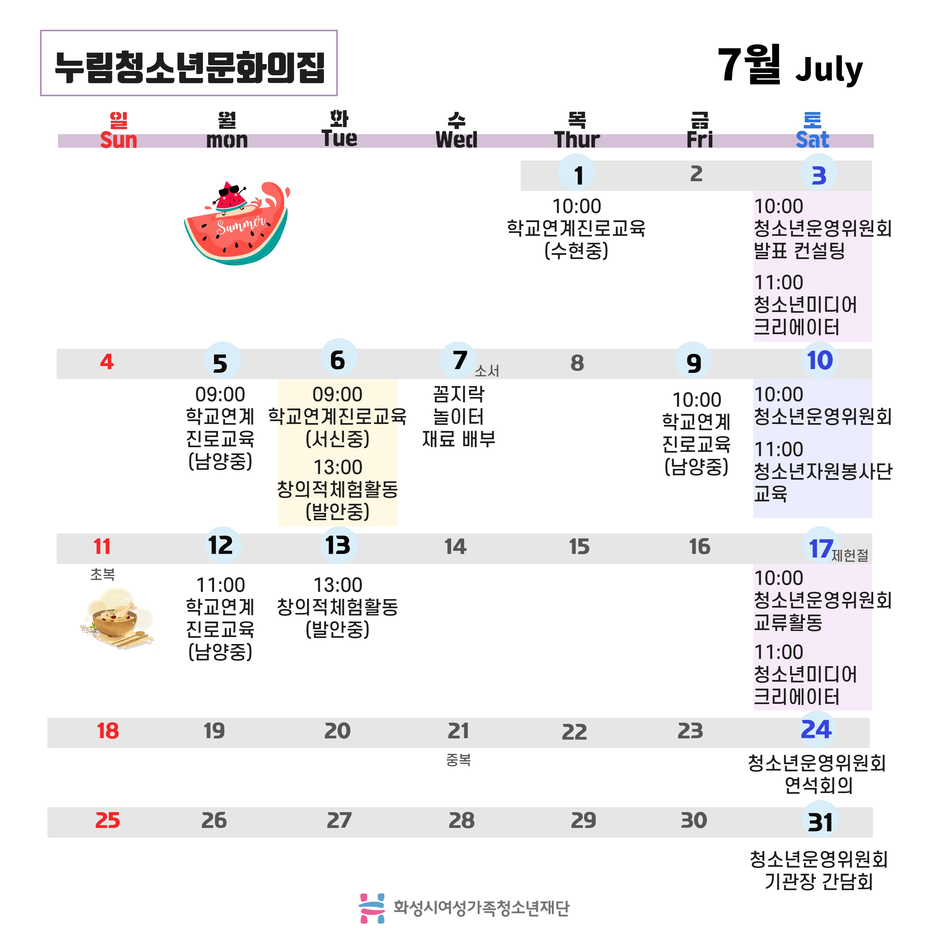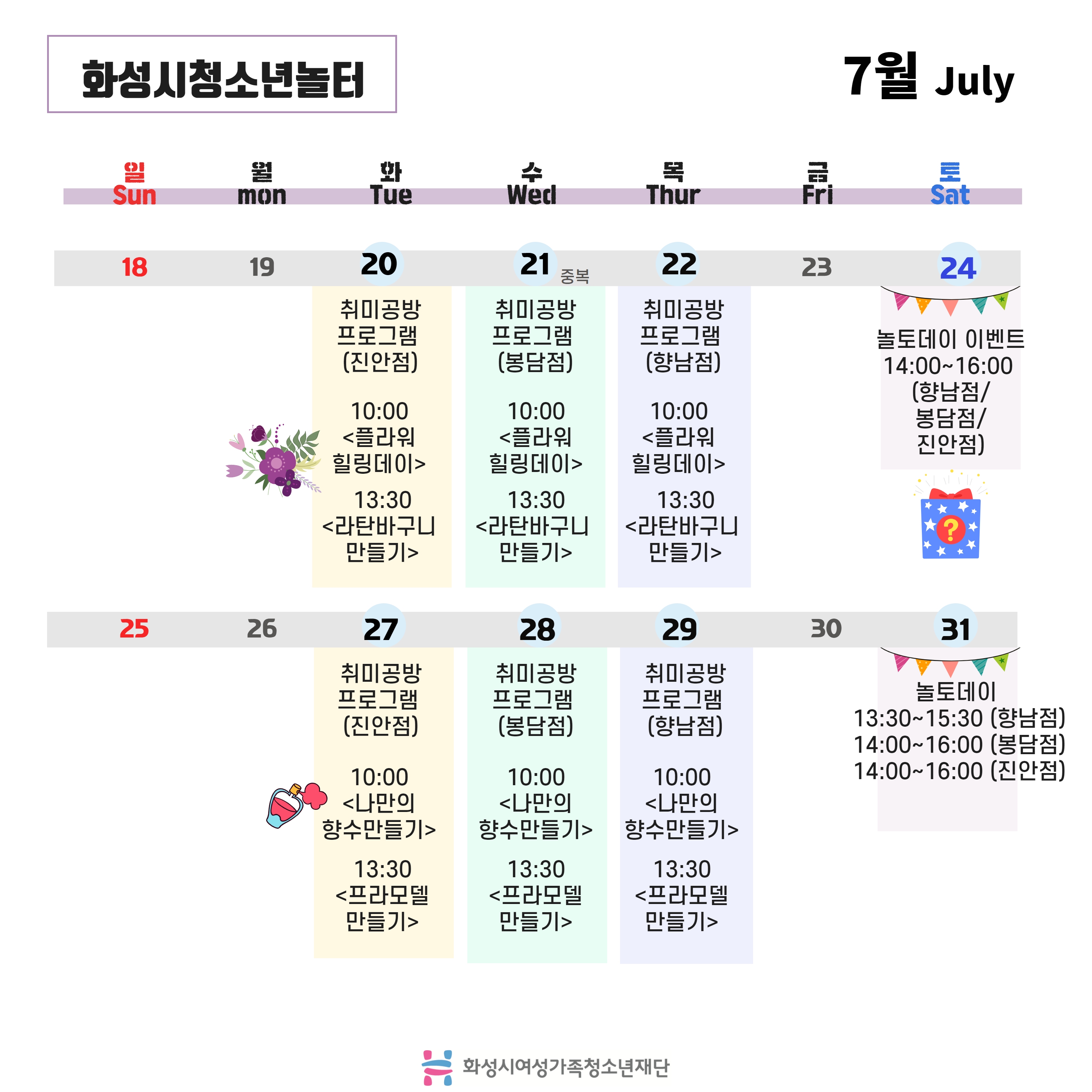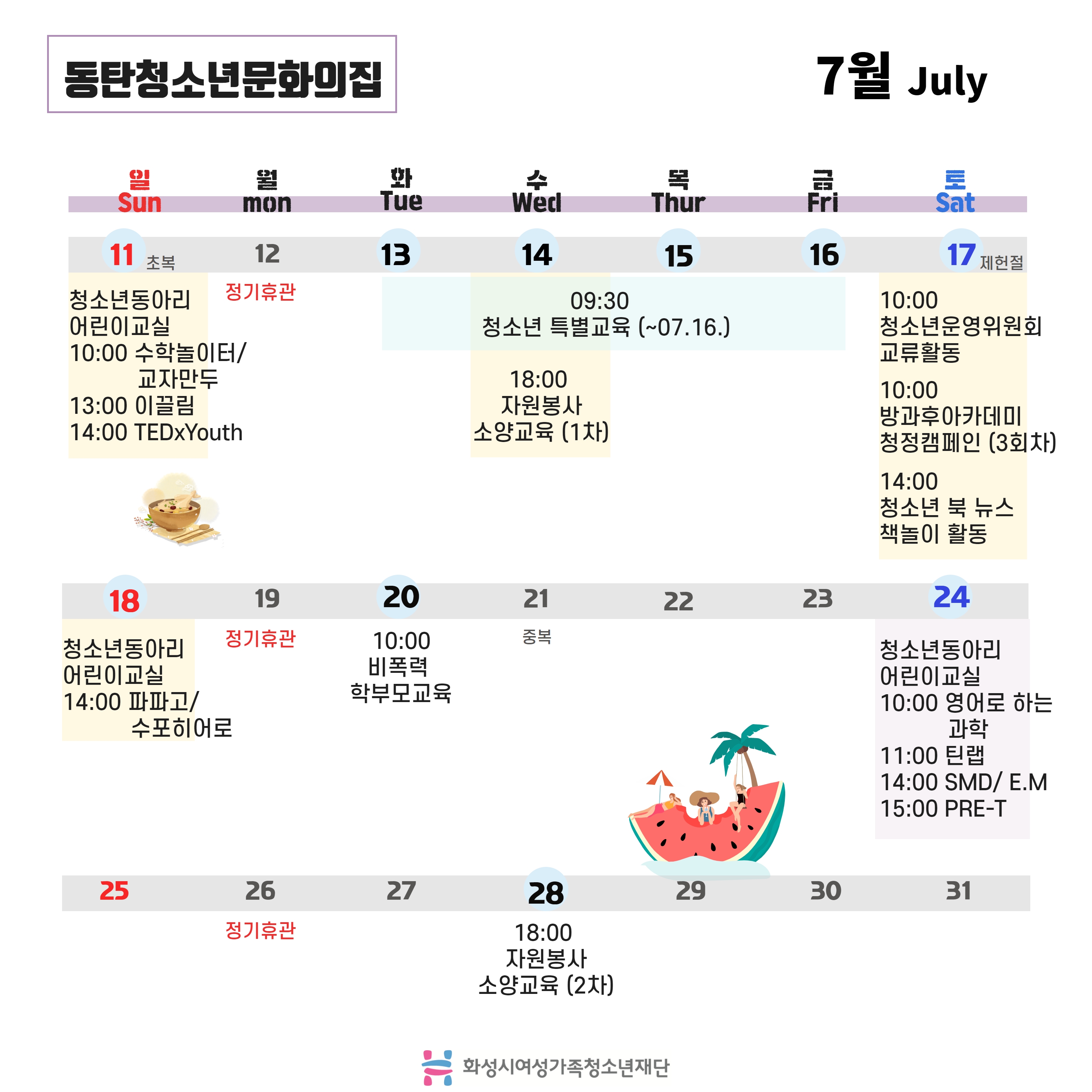| 제목 | 화성시여성가족청소년재단 7월 일정 안내 | ||