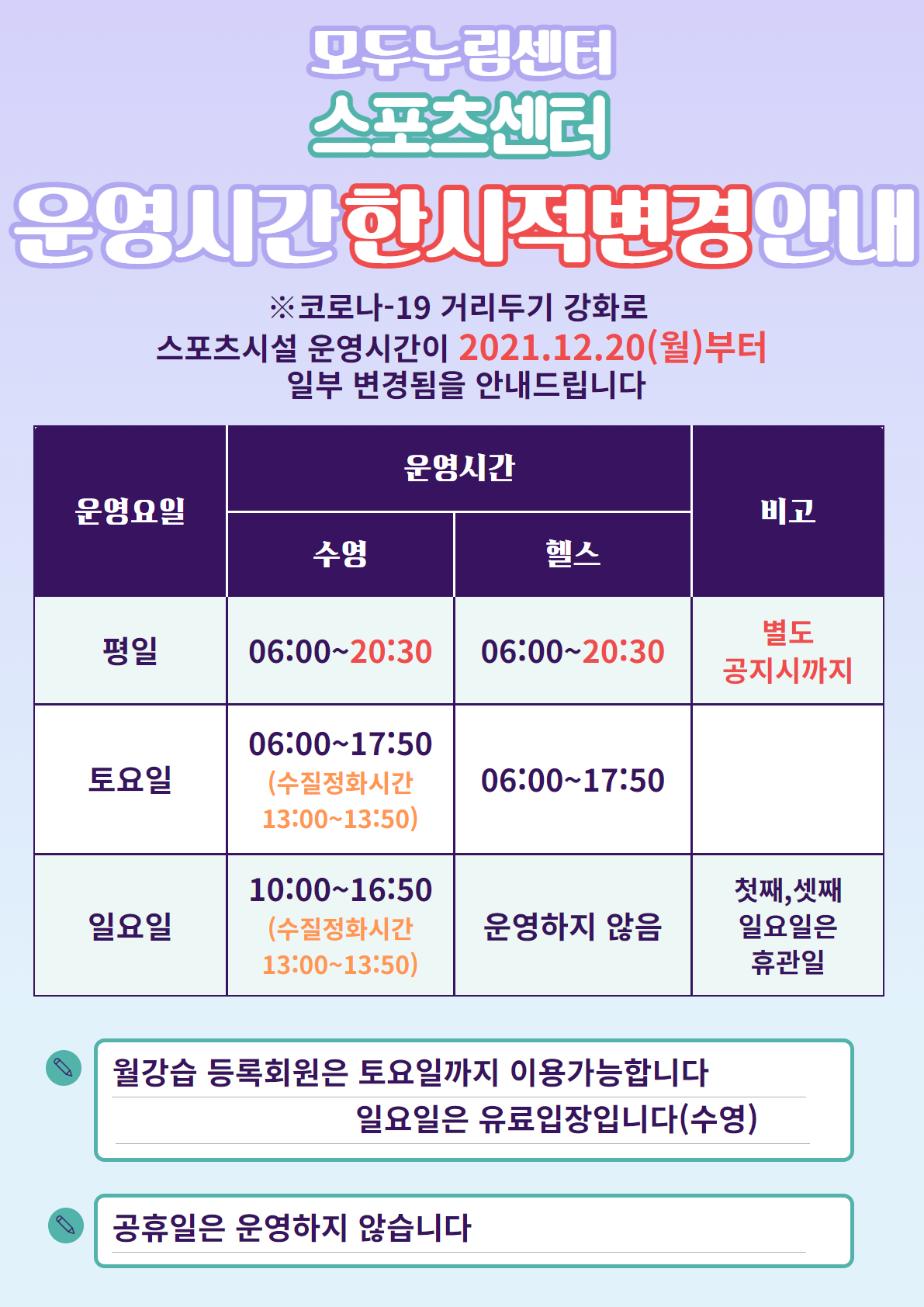 모두누림 스포츠센터 운영시간 한시적 변경안내