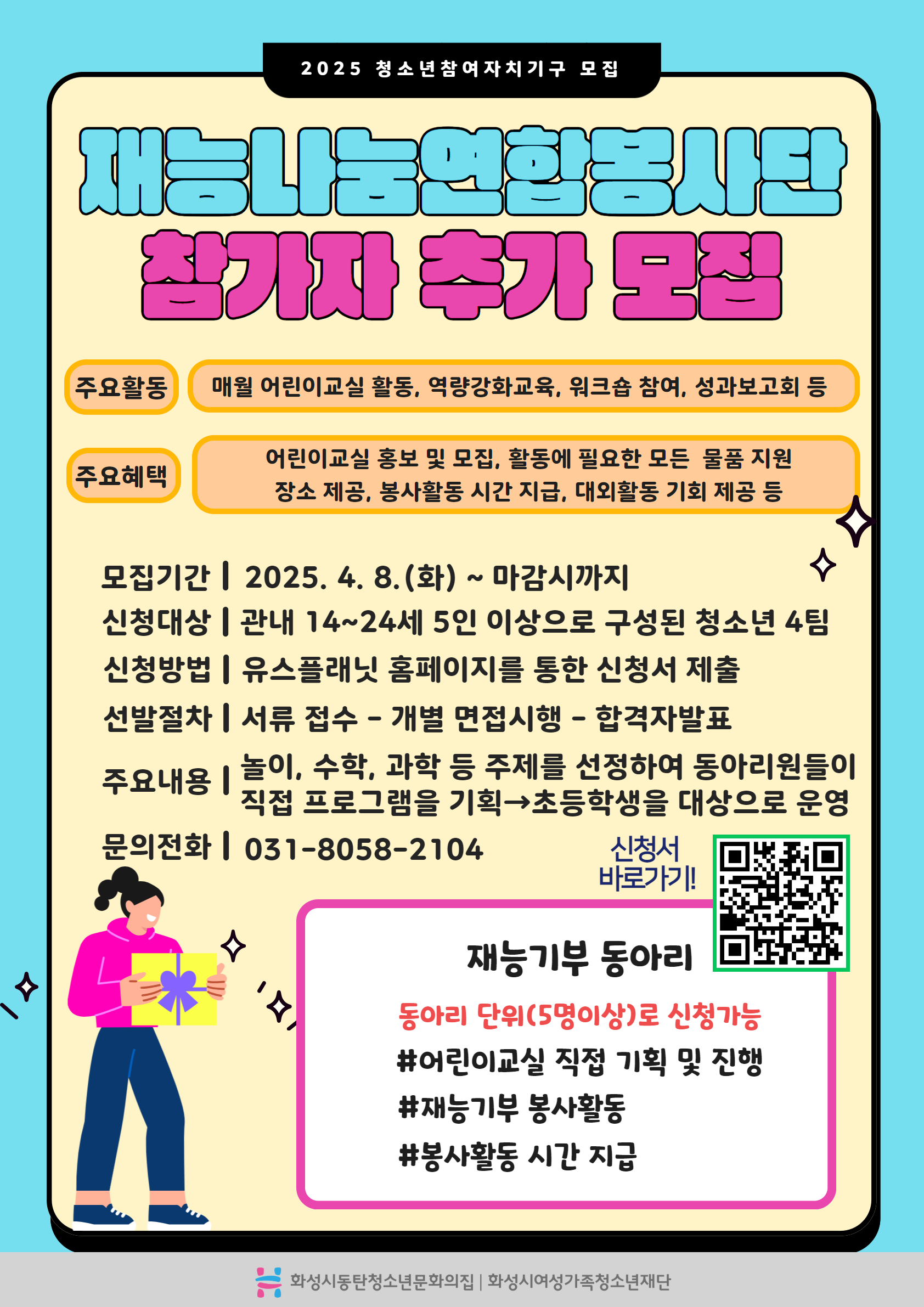 가. 사업기간: 2025. 3. ~ 12. 나. 모집대상: 관내 14~24세 5인 이상의 청소년으로 이루어진 4팀 다. 신청방법: 유스플래닛 홈페이지를 통한 신청서 제출 라. 선발절차: 서류접수 - 개별 면접 시행 - 합격자 발표 마. 주요내용: 수학, 과학, 놀이 등 주제를 선정하여 직접 프로그램 기획 → 초등학생을 대상으로 수업 진행 바. 문의: 031-8058-2104