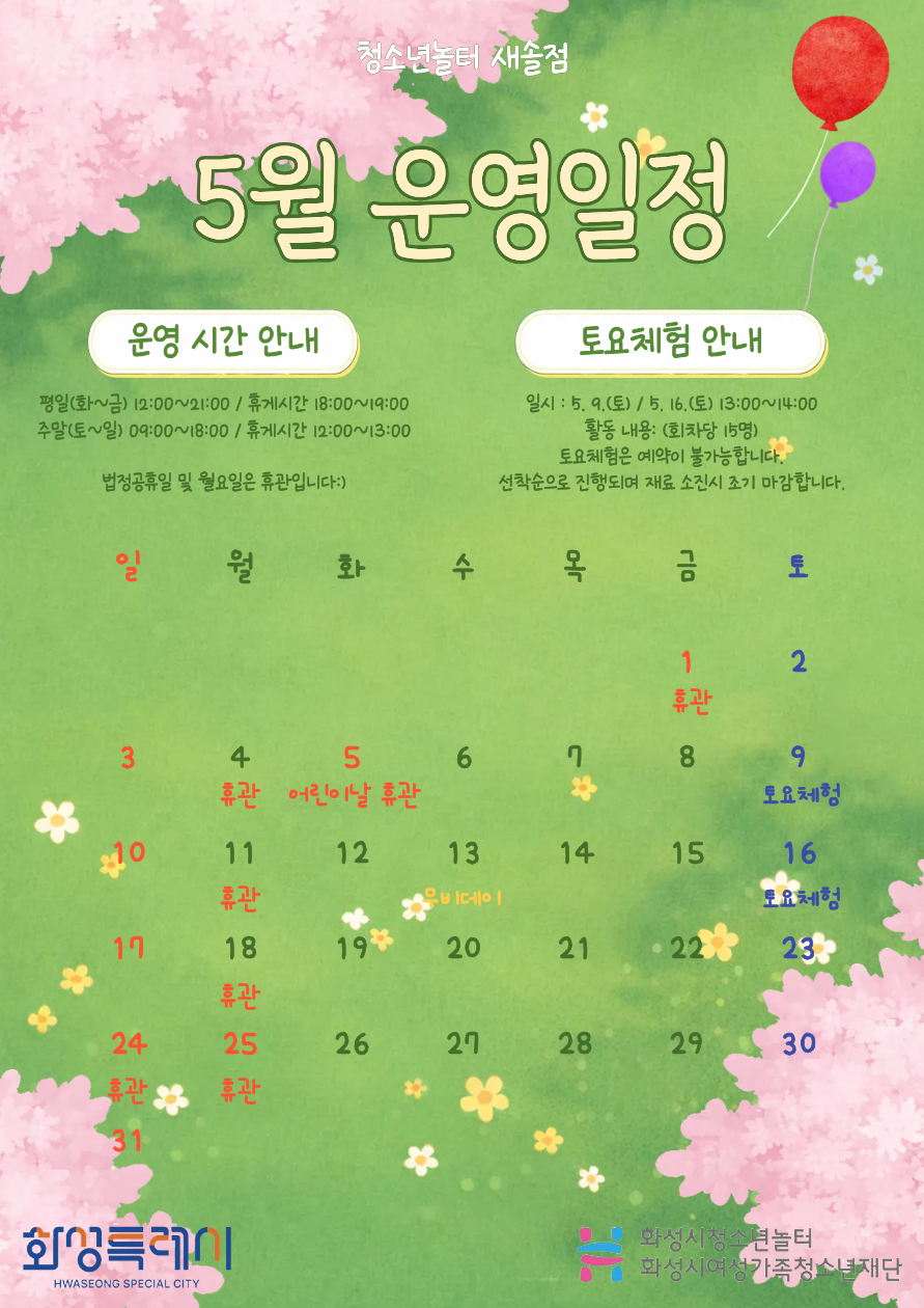 | 제목 | [청소년놀터 새솔점] 5월 운영일정 및 휴관 안내 | ||