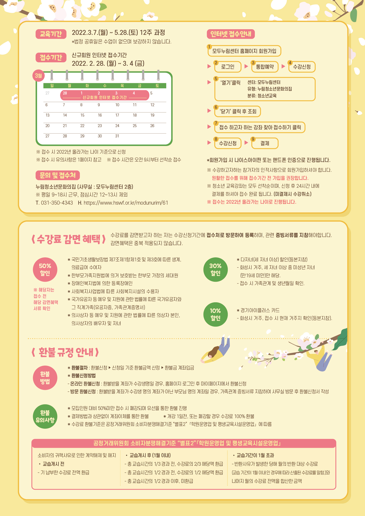 | 첨부 | 파일 아이콘봄학기 교육문화 1.jpg (773.69KB)다운로드 아이콘 파일 아이콘봄학기 교육문화 2.jpg (1.17MB)다운로드 아이콘 파일 아이콘봄학기 잔여석 안내.png (137.47KB)다운로드 아이콘 | ||