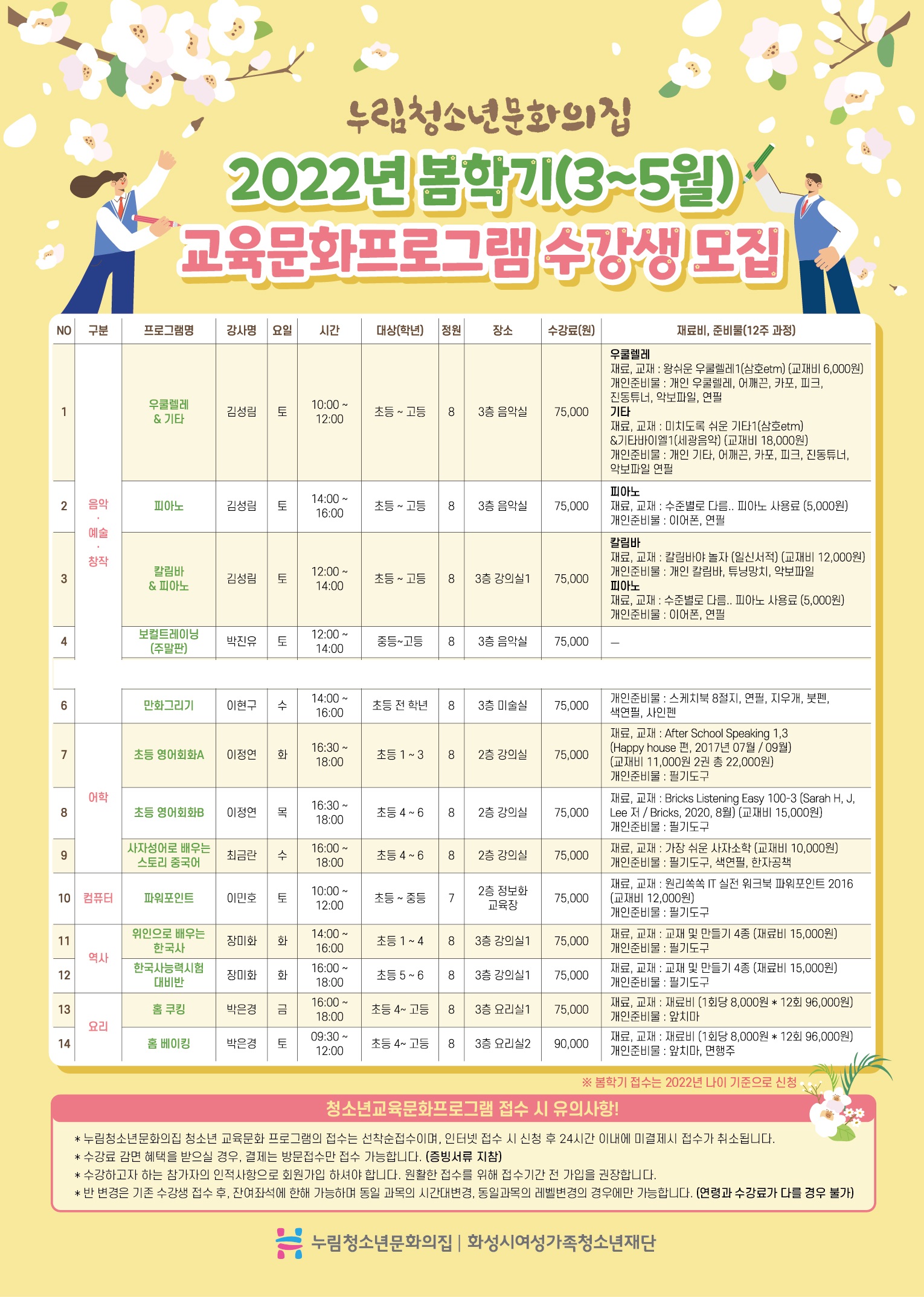 | 제목 | 2022년 누림청소년문화의집 교육문화프로그램 봄학기(3월 ~ 5월 12주) 수강생 모집안내(03.02. 09:00 기준 잔여석 공지) | ||