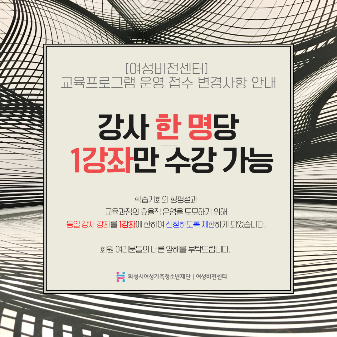 | 제목 | [화성시여성비전센터] 2026년 2학기 교육프로그램 강사당 수강신청 강좌수 제한 안내 | ||