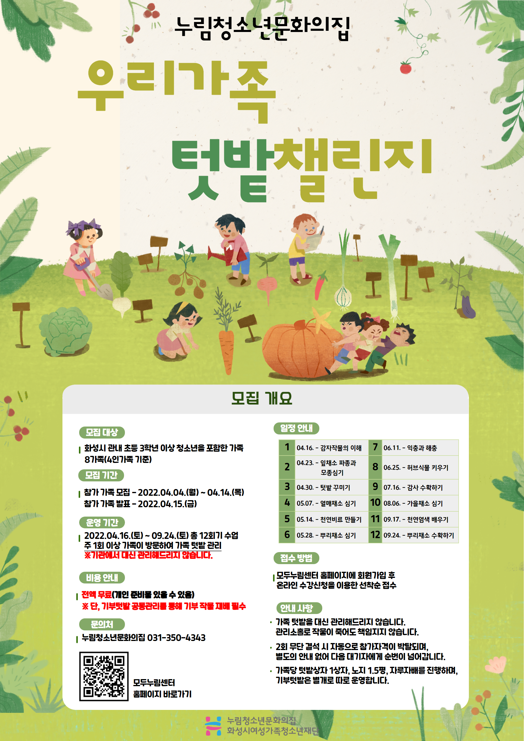 | 제목 | 2022 누림청소년문화의집 우리가족 텃밭 챌린지 참가 가족 모집 | ||