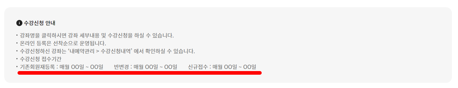 다만, 통합예약 페이지 상단 수강신청 안내에 기존회원재등록기간과, 반변경/신규접수 등 접수기간에 대한 일자가 모호해 신청기간을 놓치는 경우가 있어서 수정요청드립니다.