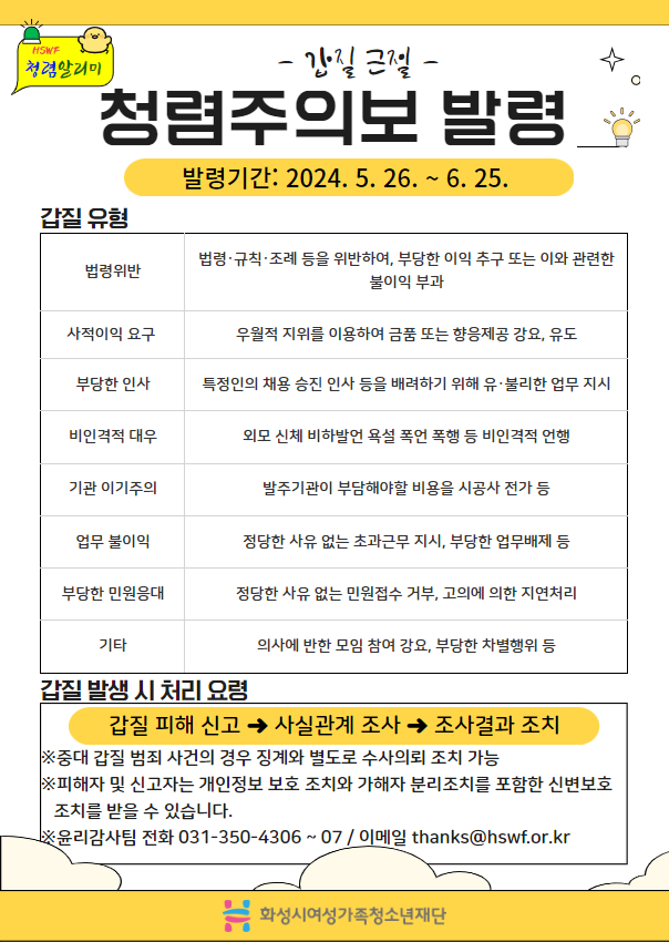 제목 [청렴알리미] 청렴주의보(2024-05호) 발령 "갑질근절" 작성일 2024년 5월 27일 15시 4분 조회수 297 첨부 파일 아이콘갑질근절.jpg (370.07KB)다운로드 아이콘 목록보기