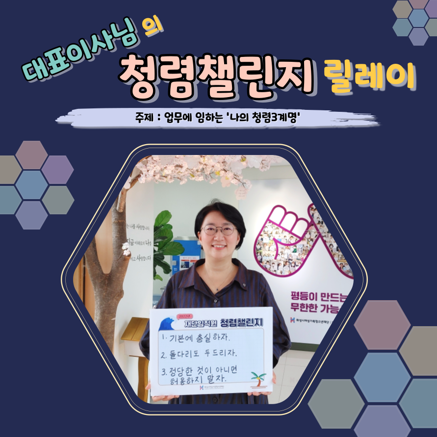 제목 [7월 대표이사님 청렴챌린지 릴레이 참여] 청렴다짐 주제 : 업무에 임하는 '나의 청렴 3계명' 작성일 2022년 7월 13일 9시 35분 조회수 226 대표이사님의 청렴챌린지 릴레이주제: 업무에 임하는 '나의 청렴3계명'1. 기본에 충실하자.2. 돌 다리도 두드리자.3. 정당한 것이 아니면 허용하지 말자. 목록보기