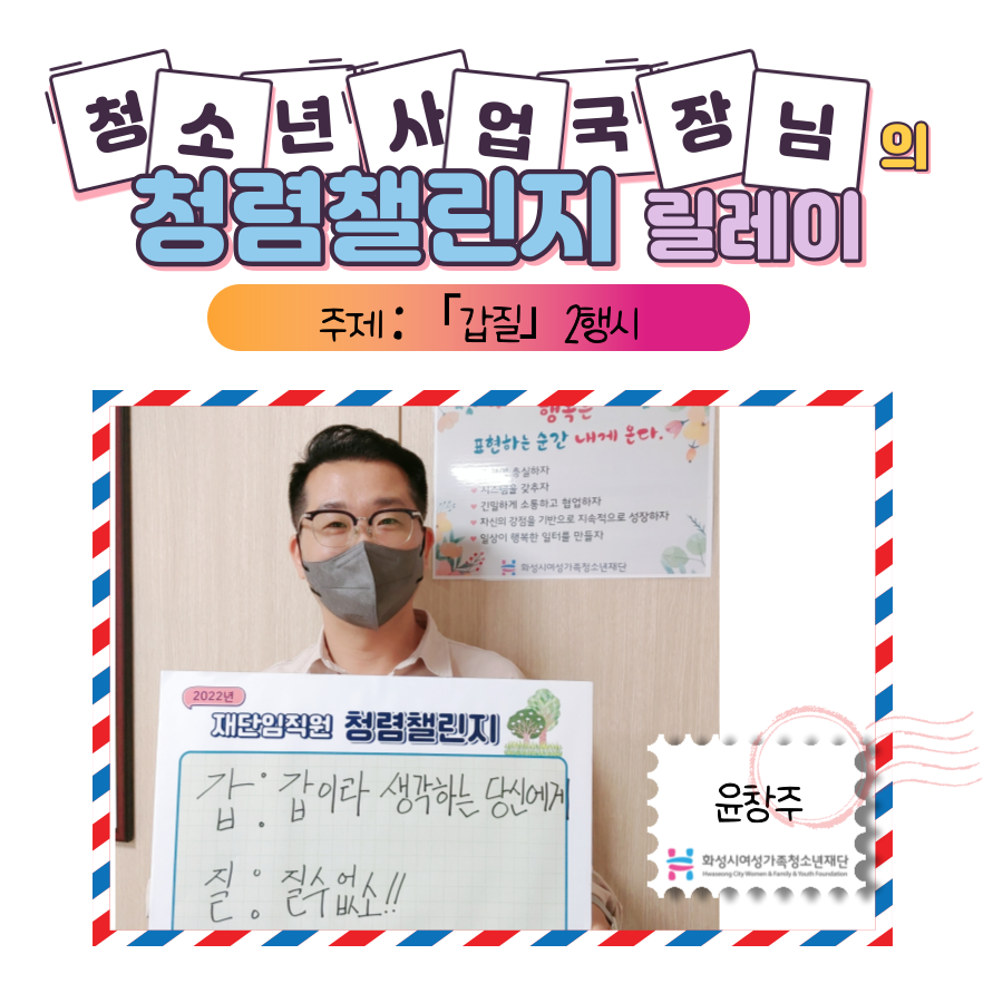 제목 [6월 청소년사업국장님 청렴챌린지 릴레이 참여] 청렴다짐 주제 : '갑질'2행시 작성일 2022년 6월 17일 13시 41분 조회수 287 청소년사업국장님의 청렴챌린지 릴레이주제: 갑질2행시갑: 갑이라 생각하는 당신에게질: 질수없소!!! 목록보기