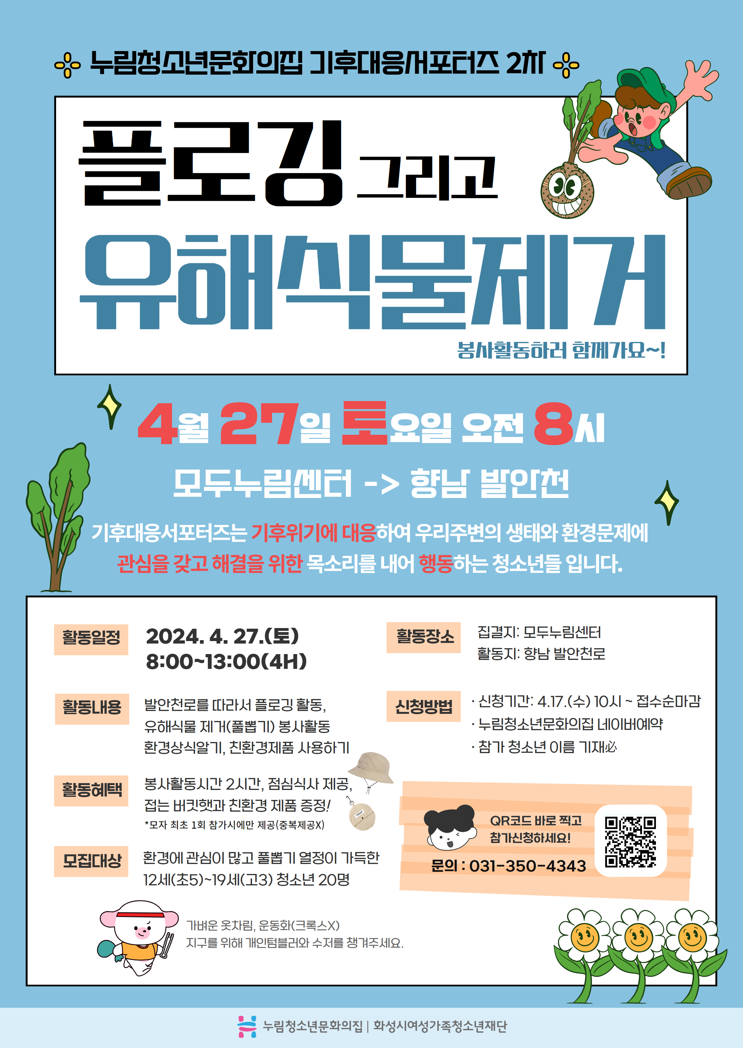 | 제목 | [누림청소년문화의집] 2024 기후대응서포터즈 2차 플로깅활동 참가청소년 모집 | ||
