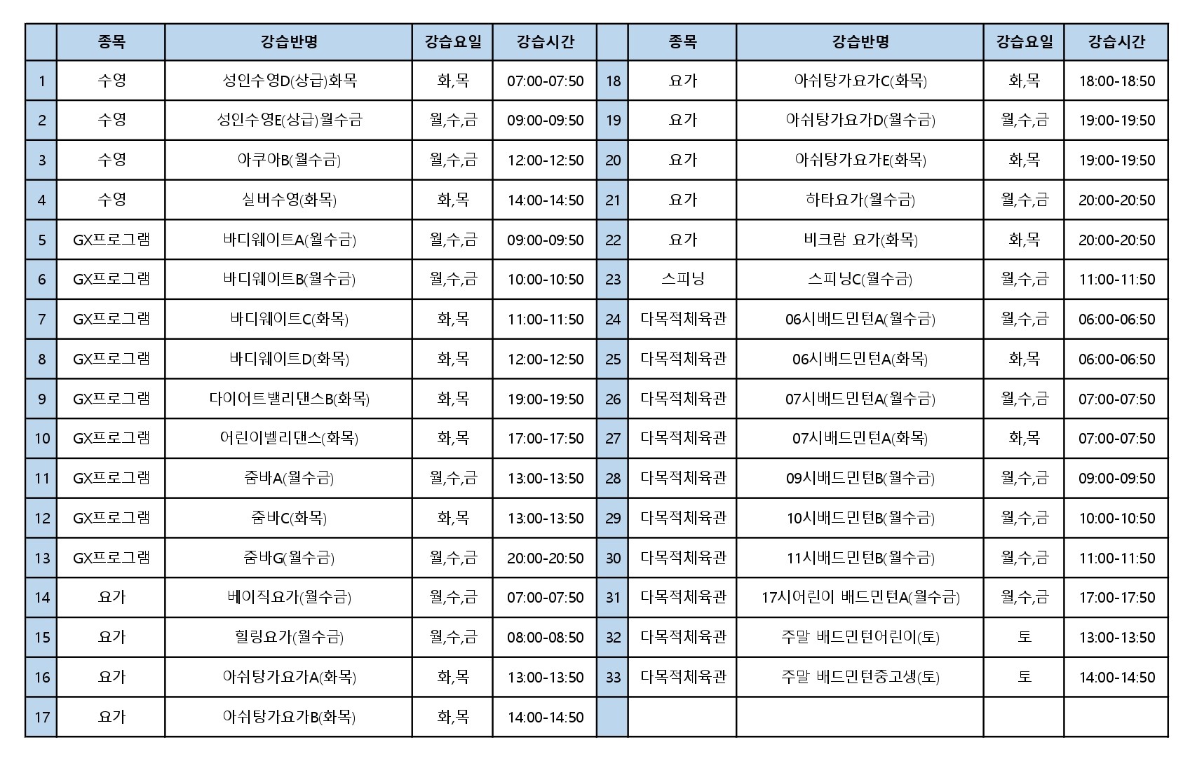 1월 스포츠 프로그램 접수기간이 만료되었음에도 접수인원이 저조한 과목을 부득이하게 폐강하게 되었습니다.