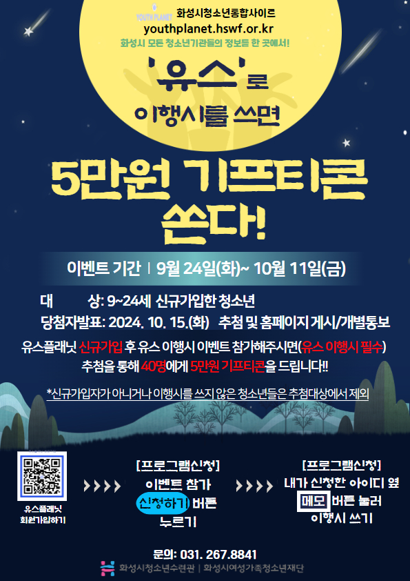 화성시청소년통합사이트 유스플래닛 2차 정기 이벤트를 실시합니다 신규가입해주시고 '유스' 이행시이벤트에 참가해주시면 완료!! 5만원 기프티콘을 총 40명에게 쏩니다!!